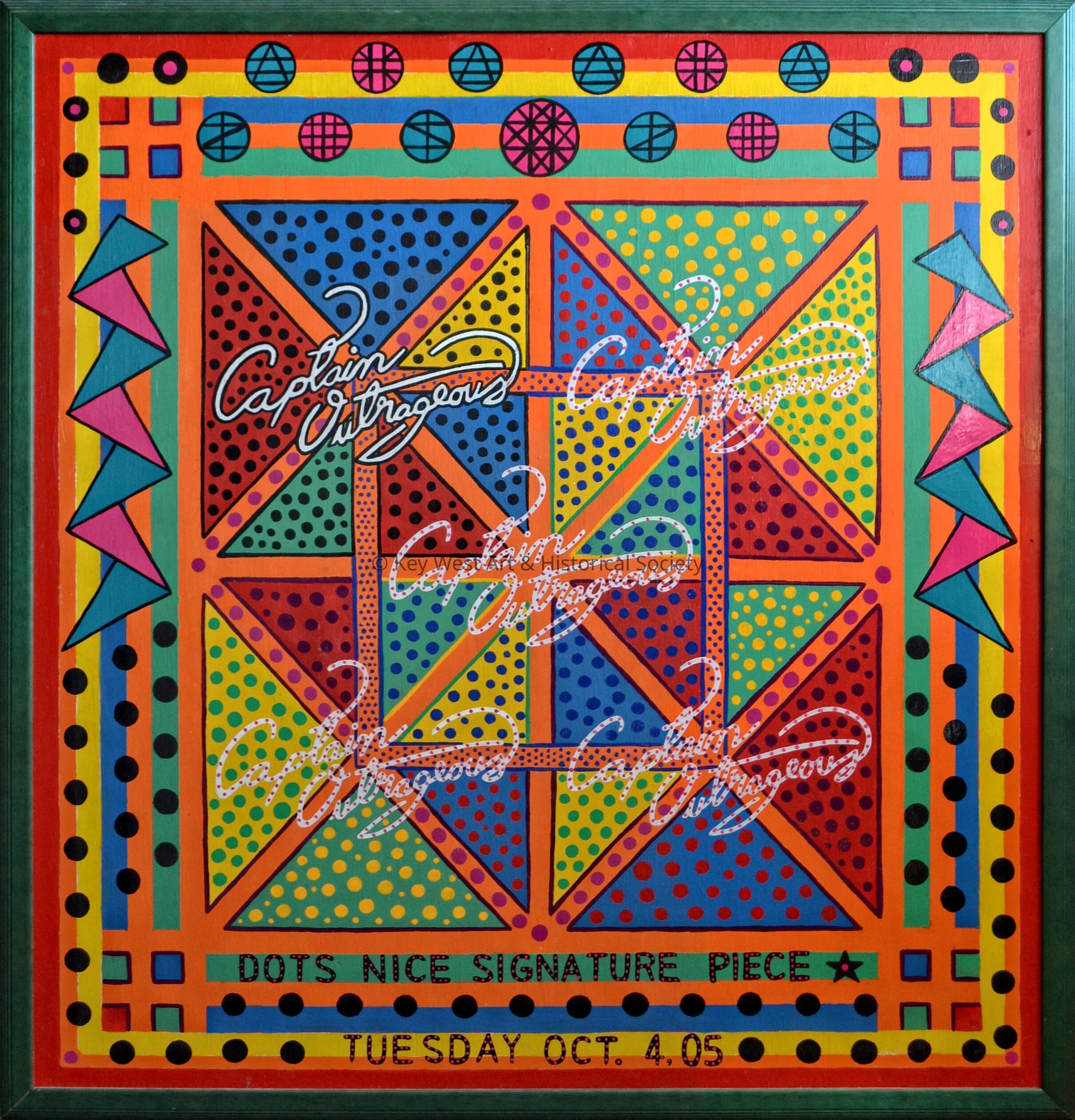 Acrylic painting by Captain Outrageous (Norman Taylor) depicting a series of geometric shapes painted in bright colors in the artist's typical style.Type of Painting