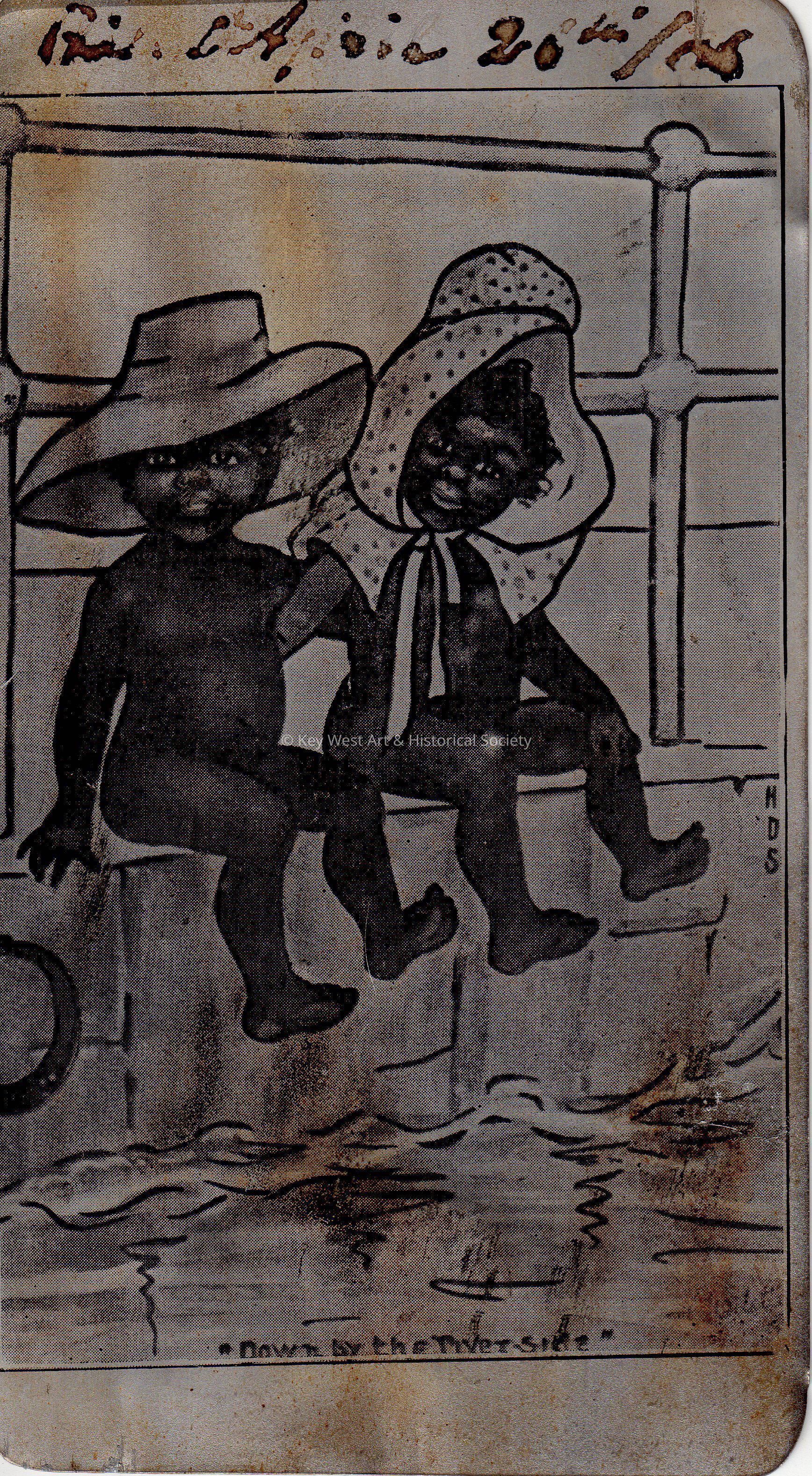Postcard depicting two unclothed children in hats near the water. The caption reads, ‘Down by the Riverside’. The card is addressed to Miss Carrie E. Watson, c/o Post Office Department, Key West, Florida.Collection