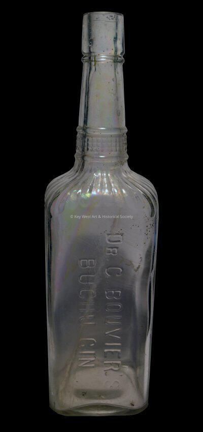 Clear gin bottle with 'Dr. C. Bouvier's Buchu Gin' embossed on the side. It contained 'buchu gin', a potion made by straining gin liquor through the leaves of the Latin American buchu plant, presumably taking along their essence and health-giving properties. Dr. C. Bouvier’s Buchu Gin was advertised as a remedy for kidney and bladder diseases or for 'general disability'. The bottle was originally excavated by the donor's mother, Grace Curlee, during the restoration of Fort Zachary Taylor in the 1960s.Collection