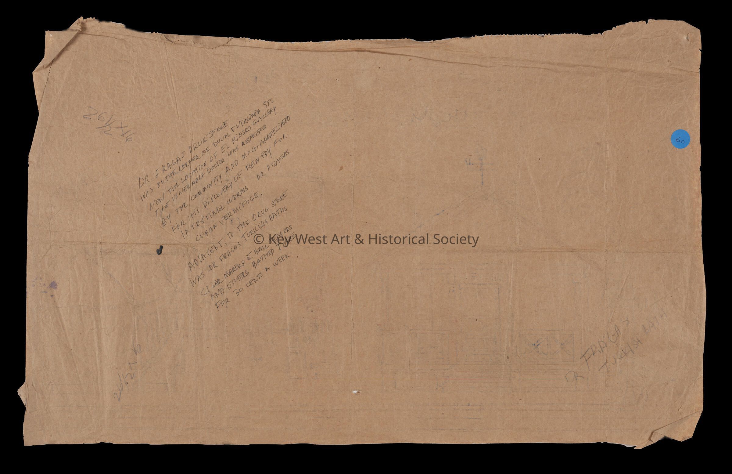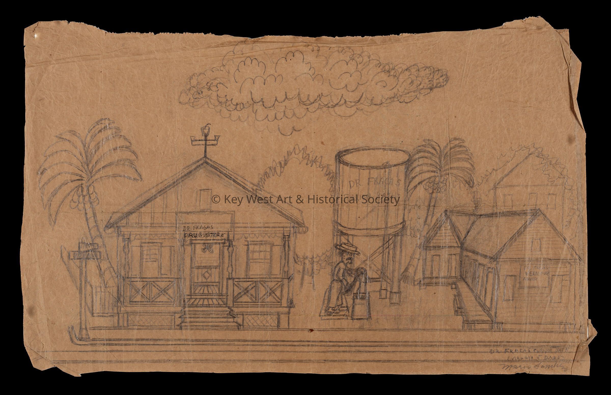 Pencil sketch on an unfolded paper bag by Mario Sanchez depicting Dr. Fraga's Drug Store and Turkish Baths on the corner of Duval and Virginia streets. On the verso is a narrative written by Sanchez, 'Dr. Fragas drugstore was on the corner of Duval & Virginia Sts. Now the location of El Kiosko Gallery. The venerable doctor was respected by the community and much appreciated for his discovery of remedy for intestinal worms - Dr. Fragas Cuban Vermifuge. Adjacent to the drug store was Dr. Fragas Turkish Baths. Cigar makers, T Ball players and others bathed there for 30 cents a week.'Type of Drawing