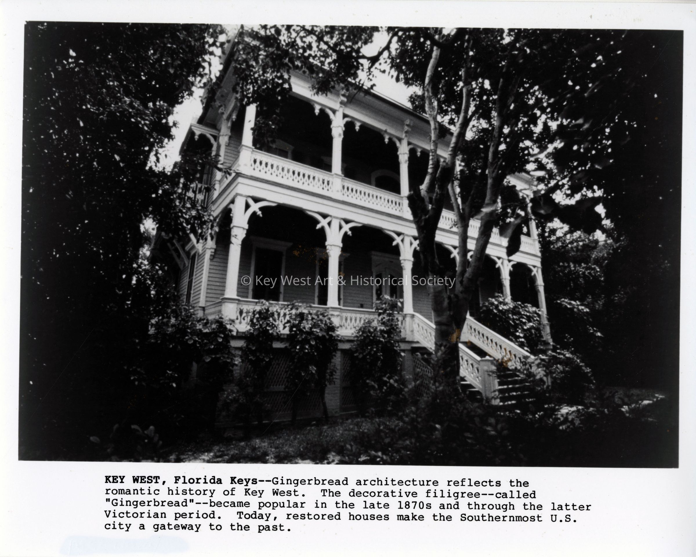 Black and white photograph of the Dr. Joseph Yates Porter House at 430 Caroline Street on the corner of Duval Street. Caption reads, 'Gingerbread architecture reflects the romantic history of Key West. The decorative filigree - called 'gingerbread' - became popular in the late 1870s and through the latter Victorian period. Today, restored houses make the Southernmost U.S. city a gateway to the past.'Photograph Details