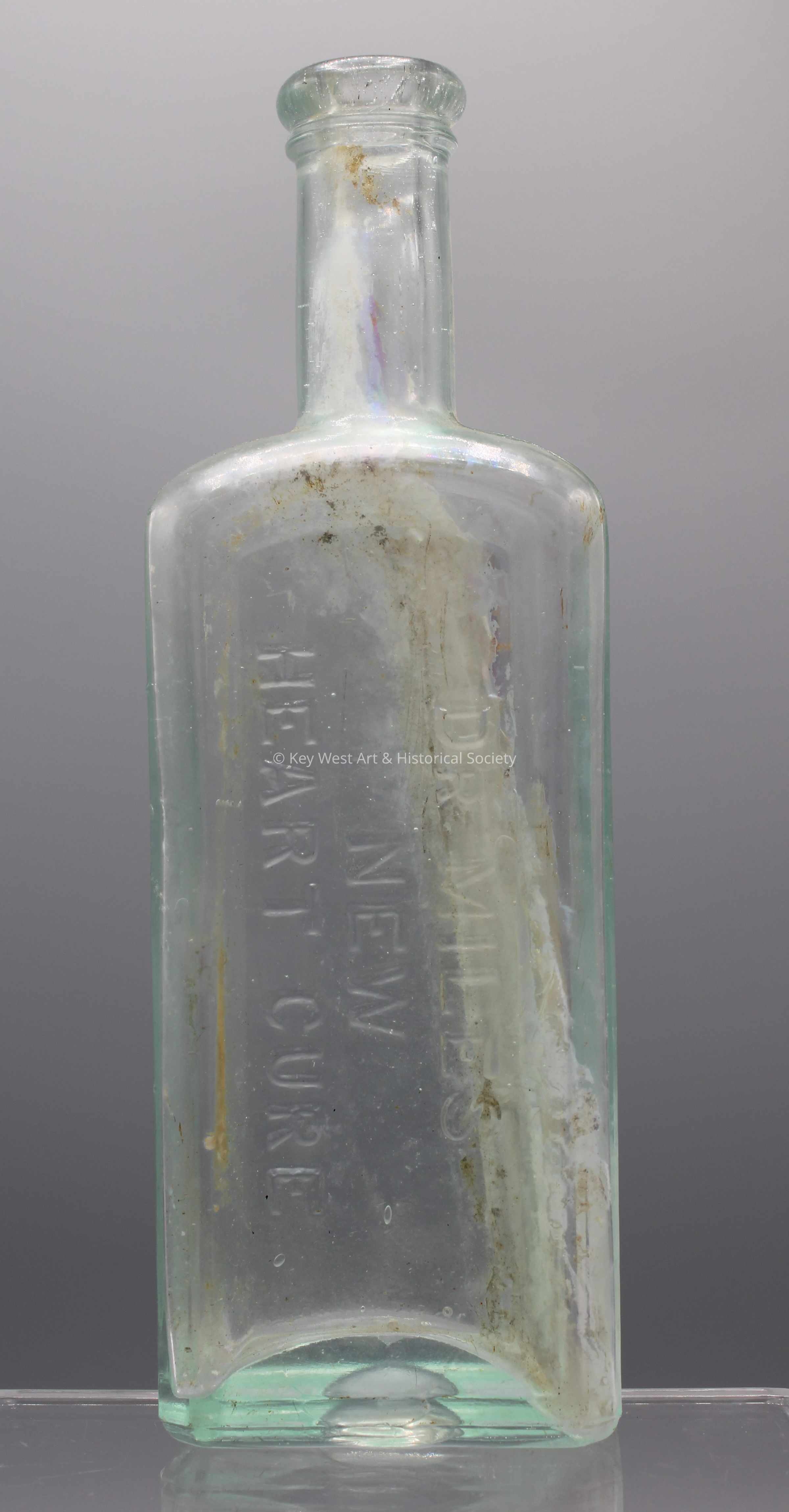 Very light blue glass bottle, rectangular in shape, with 'Dr. Miles / New / Heart Cure' embossed on one large face.