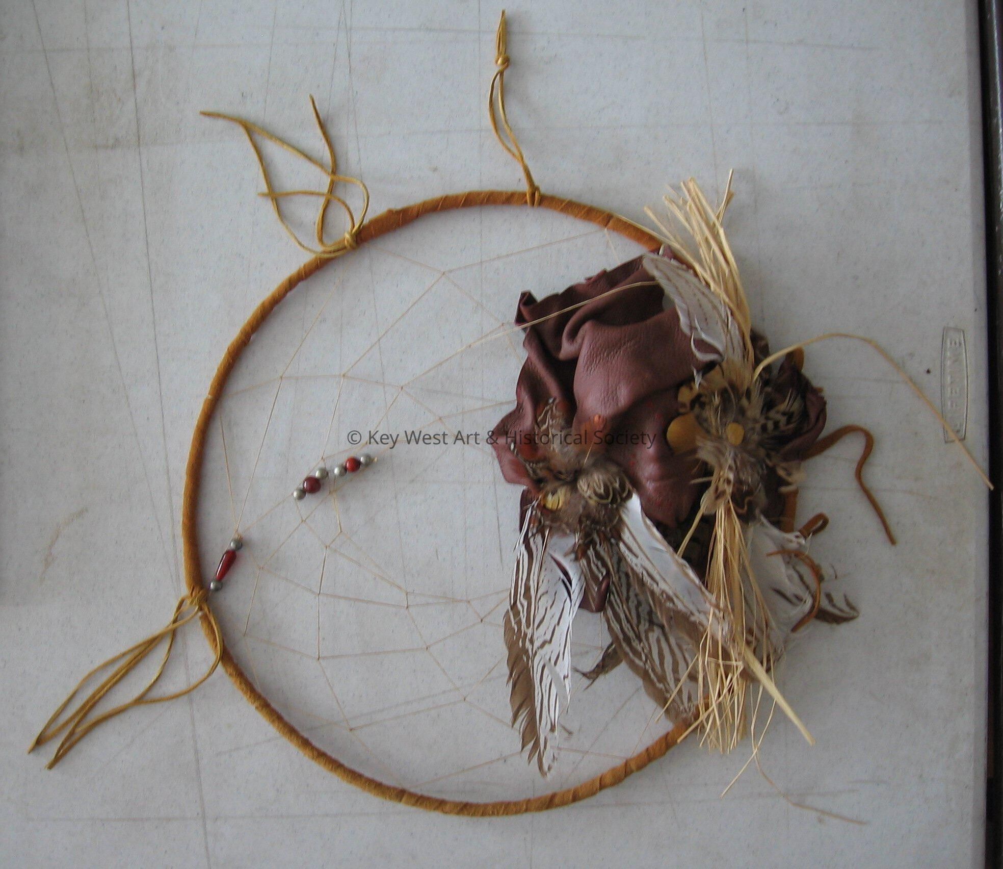 Native American dreamcatcher with beads, feathers, and leather on it.