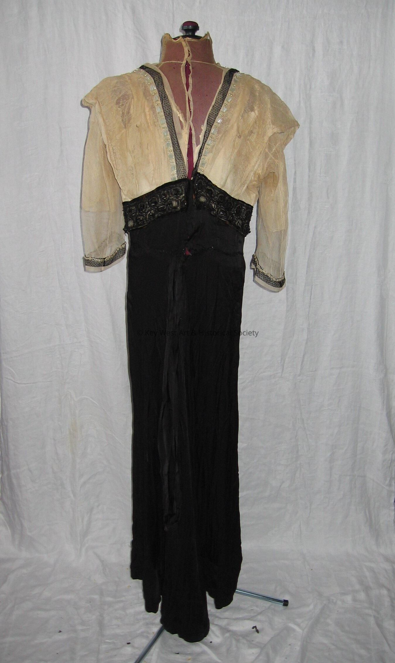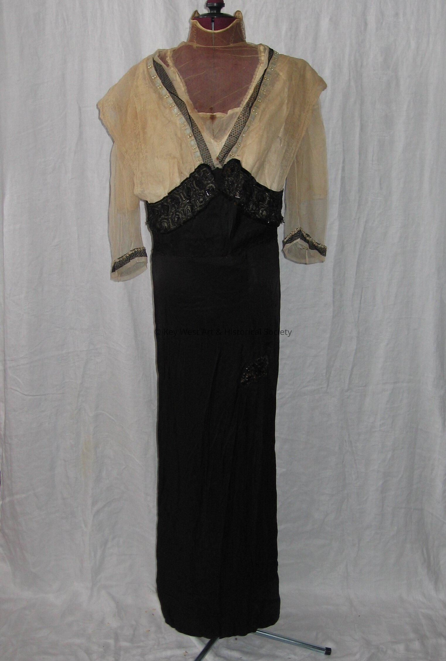 Evening dress. Empire waist. Waist and below is black silk. Waist line has black beads sewn around it. Bodice is made of layers of lace. Inside lining is satin or silk. Three quarter lace sleeves with black lace trim on the bottom. High neck.