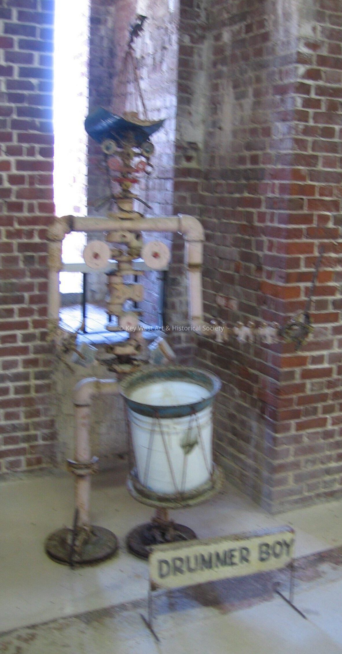 Freestanding sculpture of a drummer boy. Body made from a crank shaft mounted on two discs, breasts are piston, face is composed of various metal parts. Drum is placed in front of figure. Drum is made a plastic bucket and a wheel base.Type of Sculpture