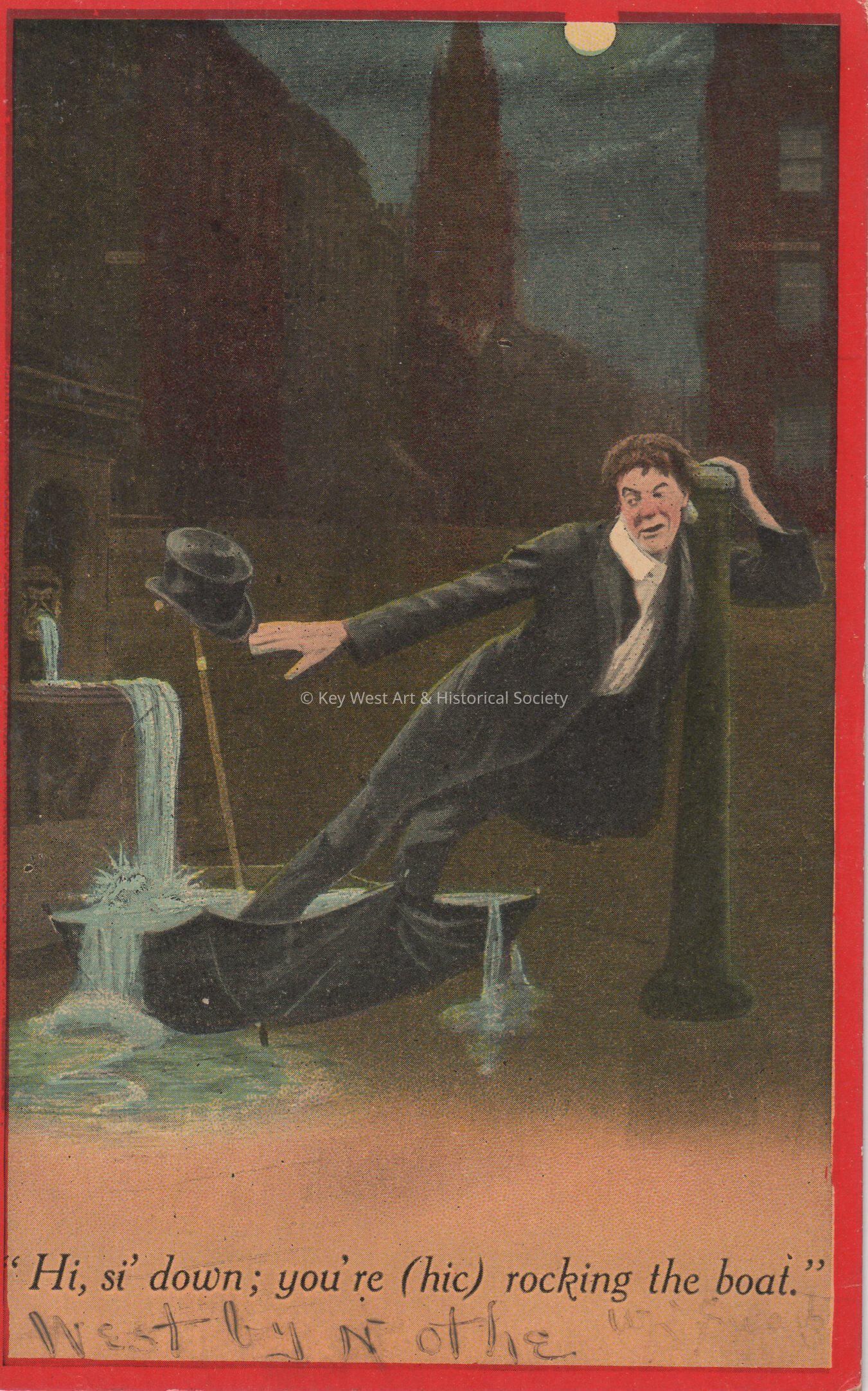 Postcard depicting a drunk man leaning on a post while standing in an umbrella full of water and talking to his hat that is atop the umbrella handle. The caption reads, ‘Hi, si’ down; you’re (hic) rocking the boat.’ The message on the front reads, 'West by N othe'. The card is addressed to Captain James R. Hattrick, Sailors Snug Harbor, Room 332, House H., New York.Collection
