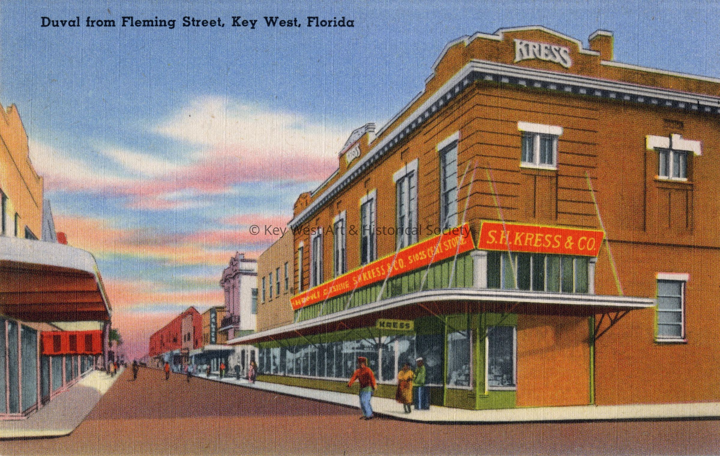 Postcard depicting the corner of Duval and Fleming streets featuring S.H. Kress & Co. building. The caption reads, ‘Duval from Fleming Street, Key West, Florida.'Subject Place