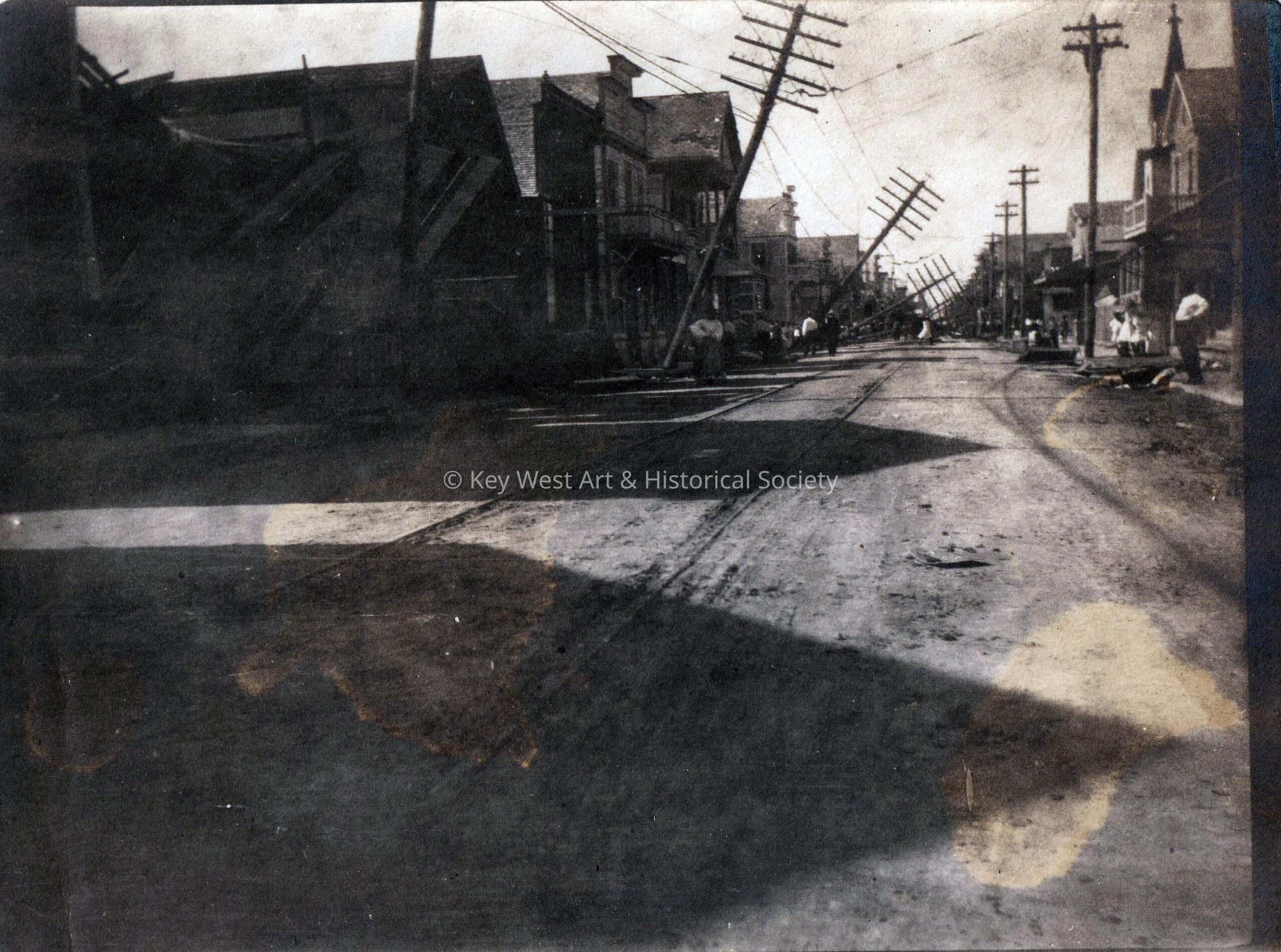 Black and white photograph of Duval Street taken after the 1910 hurricane showing the storm damage. There are downed power lines and and store fronts have been destroyed. Note on verso reads, 'Duval St. looking north. On the left is the Bethel Church (colored; not the church). The front of it is leaning against one of our poles. The 5&10c store is almost in the middle of the church'