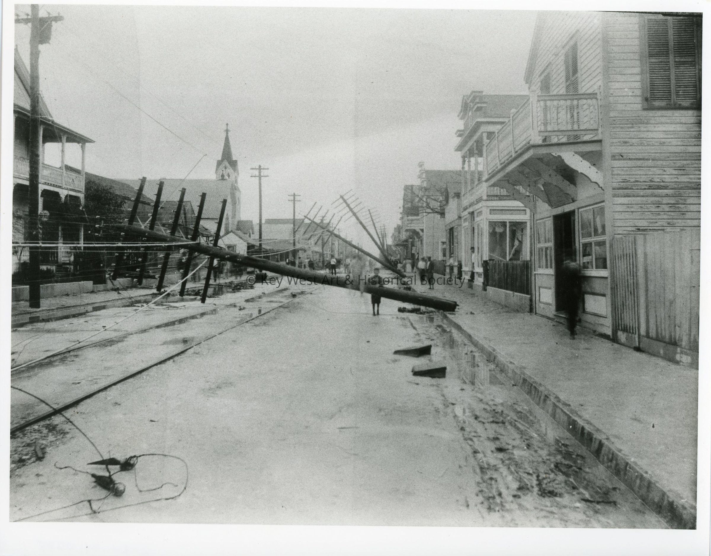 Black and white photograph of Duval Street, looking south, following the Hurricane of 1909.