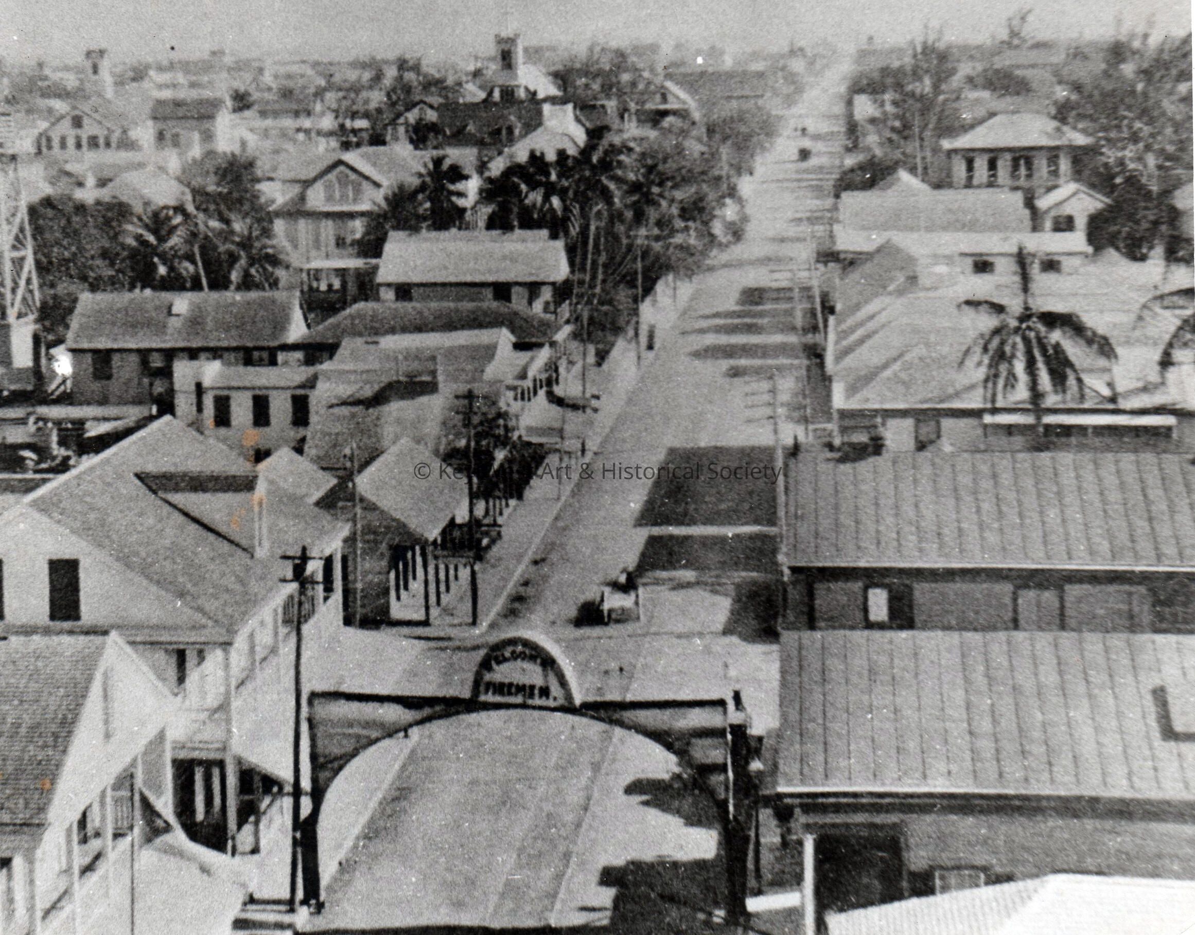 Black and white photograph of Duval Street looking south toward Greene Street taken from the top of the Jefferson Hotel. An arch spanning the street reads, 'Welcome Firemen', which was erected for a firemen's convention in 1897.Photograph Details
