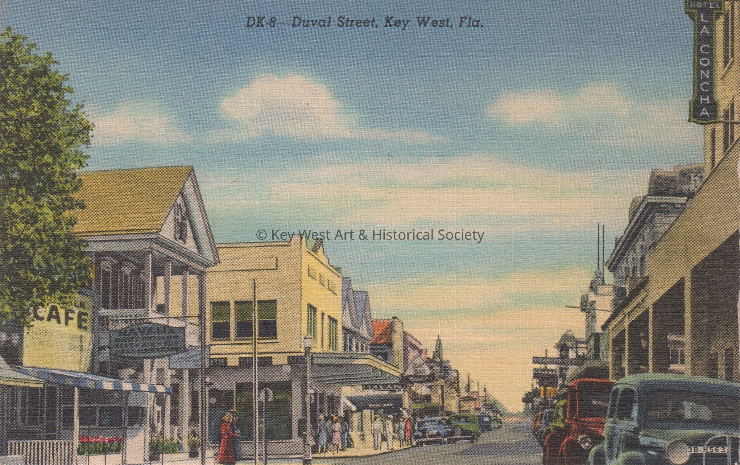 Postcard depicting, building, people, and cars on Duval Street. The caption reads, ‘Duval Street, Key West, Florida.’Collection