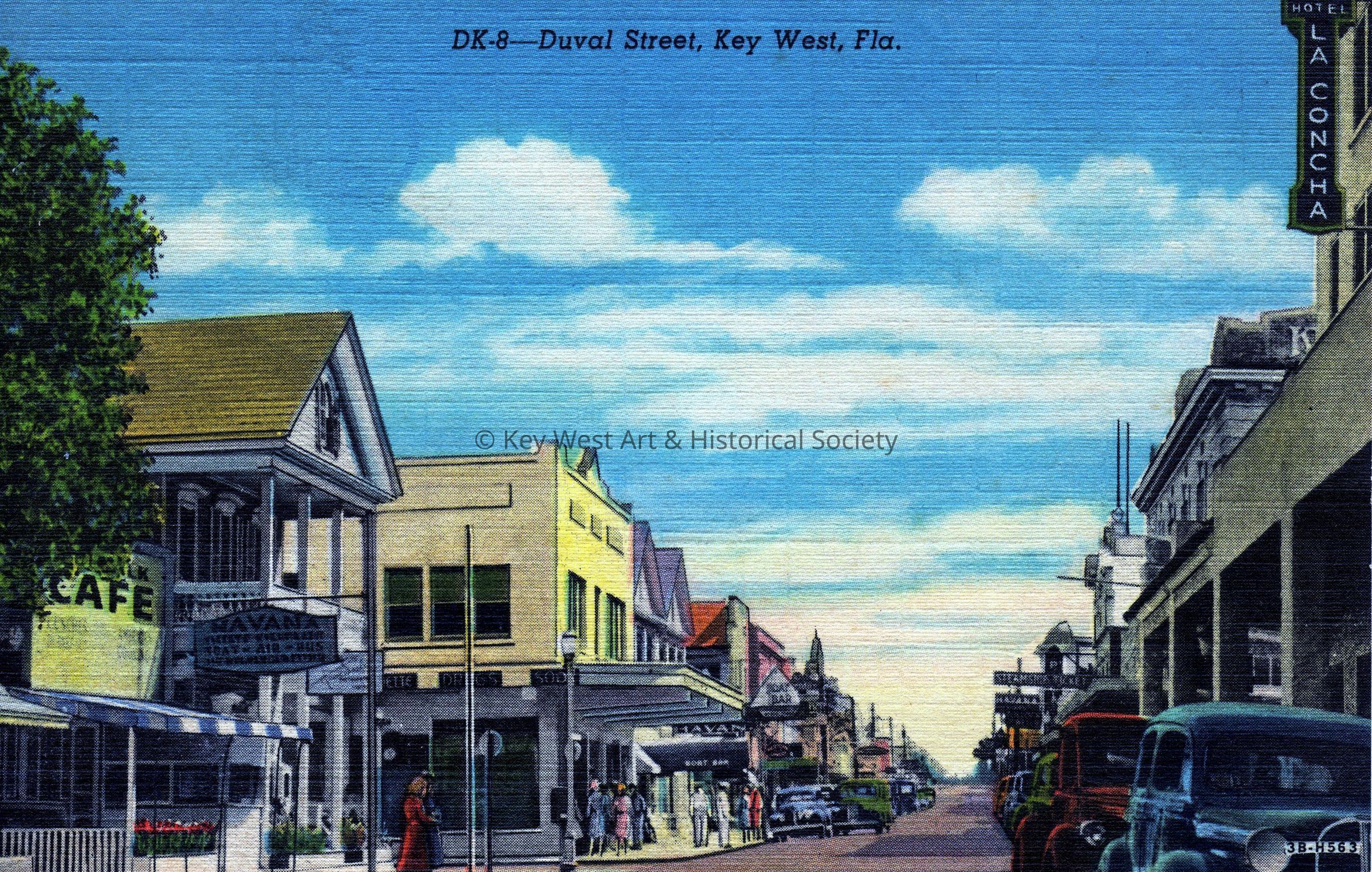 Postcard depicting cars and people on Duval Street. The caption reads, ‘Duval Street, Key West, Florida’.Collection