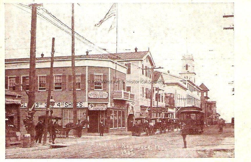 Black and white postcard of 'A busy corner in Key West', which is the corner of Duval and Greene streets.Subject Place