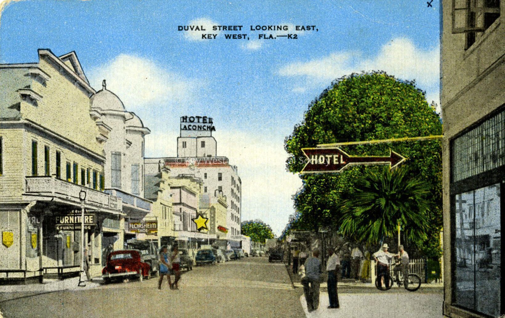 Postcard depicting the 500 block of Duval Street with the Florsheim Shoes and the La Concha Hotel. The caption reads, ‘Duval Street Looking East, Key West, Fla.’ Notation on verso, ‘Unique as an American city, Key West becauseSubject Place