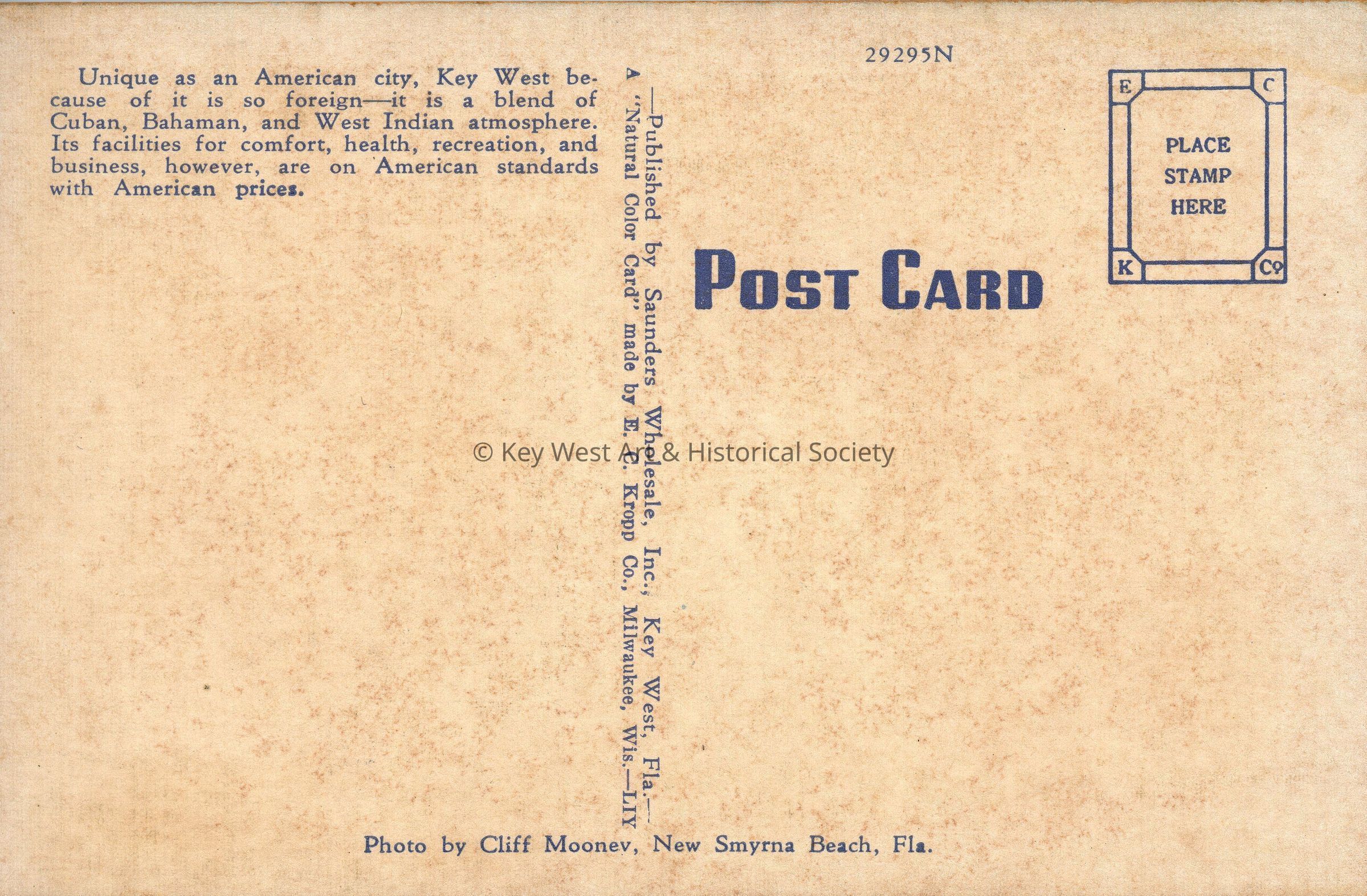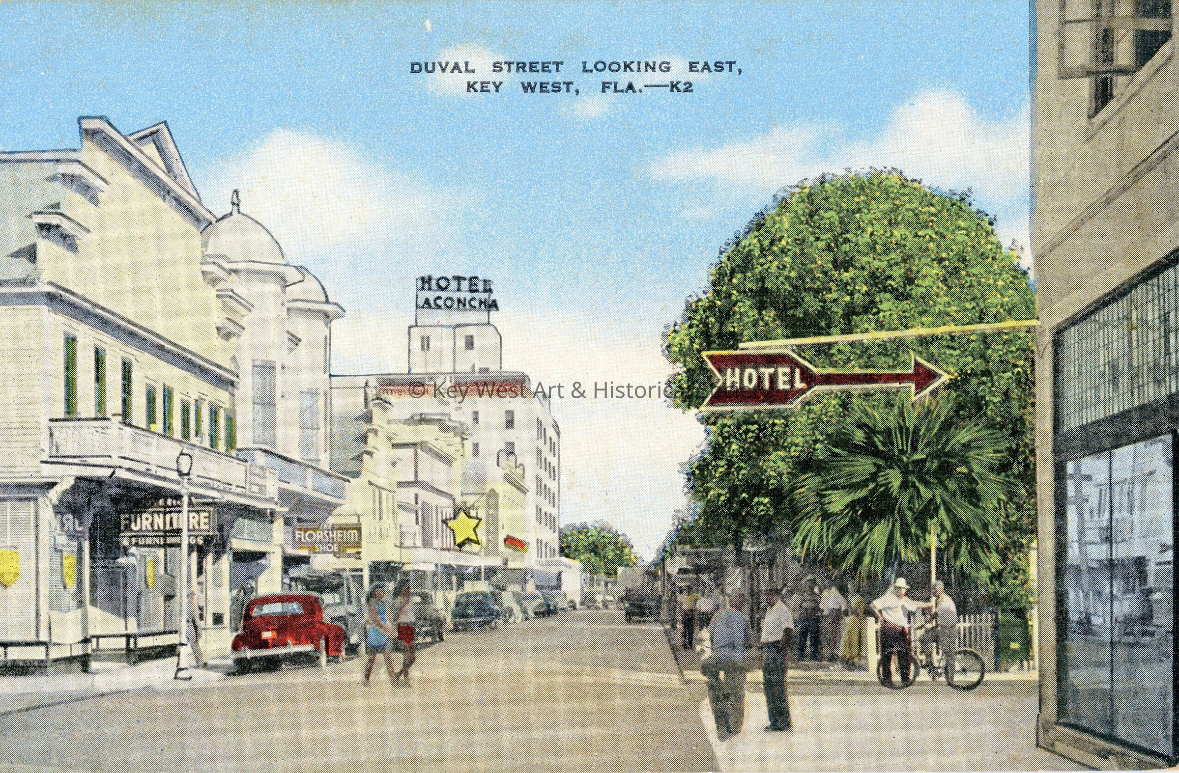 Postcard depicting the 500 block of Duval Street with Florsheim Shoes and La Concha Hotel in the background. Notation on verso reads 'Unique as an American city, Key West because of it is so foreign--it is a blend of Cuban, Bahaman, and West Indian atmosphere. Its facilities for comfort, health, recreation, and business, however, are on American standards with American prices.'Subject Place