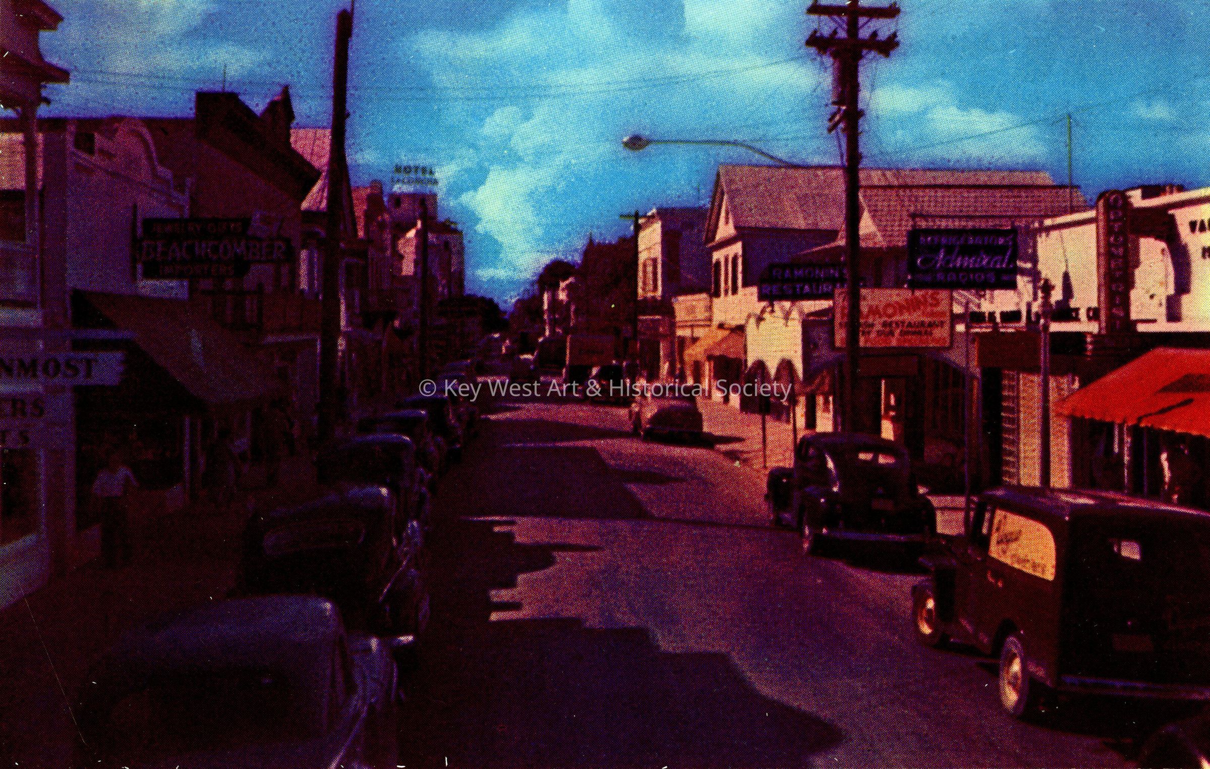 Postcard depicting a view of Duval Street looking north. The caption on the verso reads, 'A scene of the business section looking north on Duval Street in Key West, Florida.' Several businesses are visible including the La Concha Hotel, Beachcomber Jewelry, Ramonin's Restaurant and Admiral Refrigerators and Radios.Subject Place