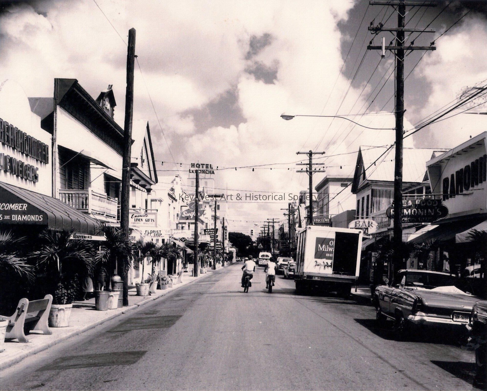 Copy of black and white digital photo looking northward from the 600 block of Duval Street.