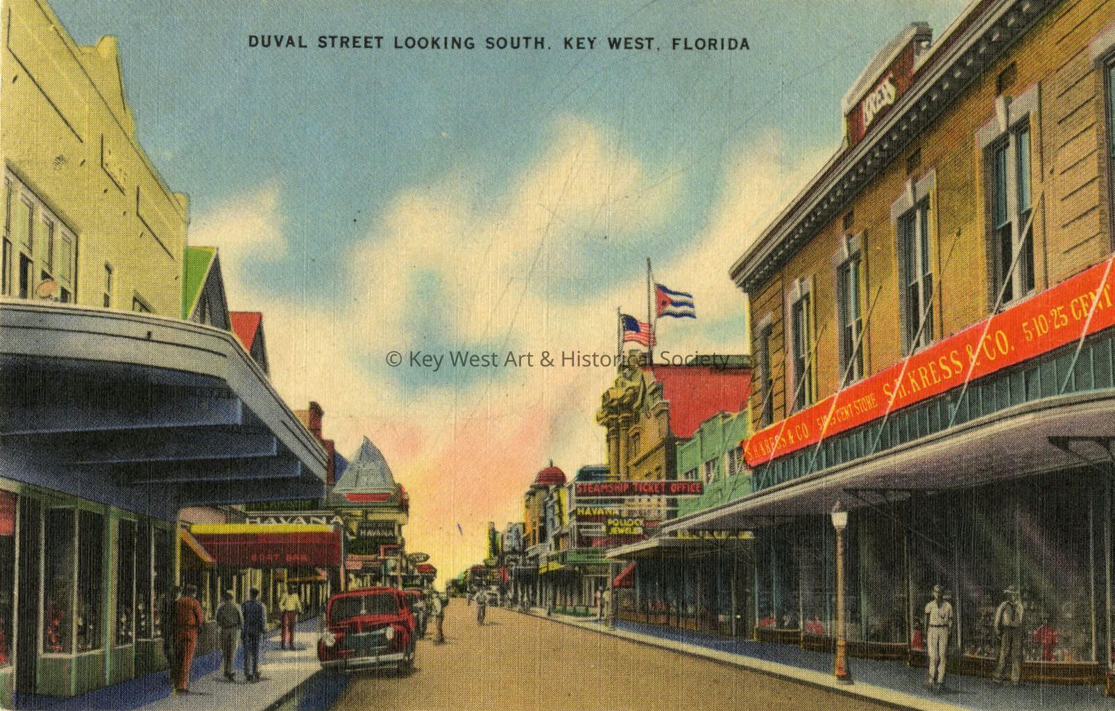 Linen postcard depicting the intersection of Duval and Fleming streets with the Kress Building, the Boat Bar and the San Carlos Institute visible. The caption reads ‘Duval Street Looking South, Key West, Florida'.Subject Place