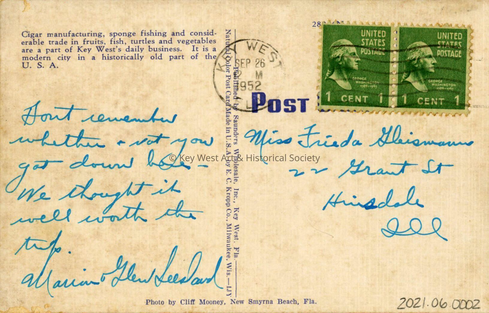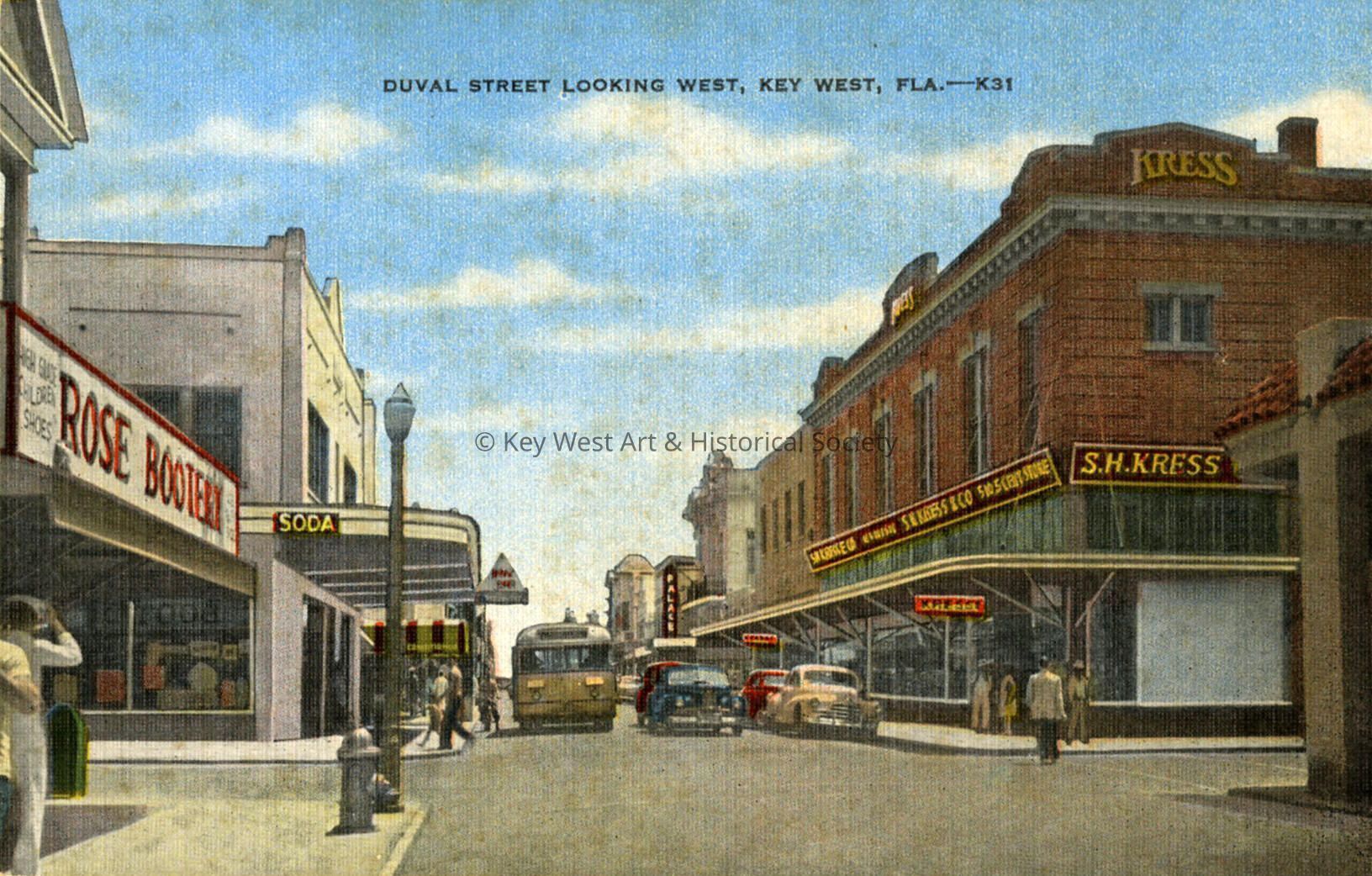 Postcard depicting the 500 block of Duval Street with the S.H. Kress store, Rose Bootery and the Boat Bar.and other commercial buildings. The caption reads, ‘Duval Street Looking West, Key West, Fla.’ The caption on the verso reads, ‘Cigar manufacturing, sponge fishing and considerable trade in fruits, fish, turtles and vegetables are a part of Key West's daily business. It is a modern city in a historically old part of the U.S.A.'Subject Place