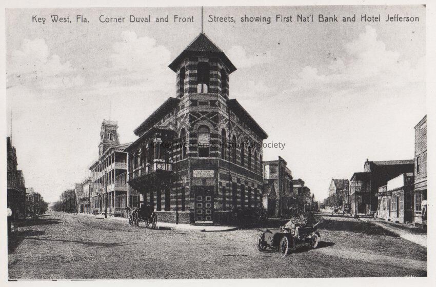 Key West, Florida. Corner of Duval and Front Streets, showing First National Bank and Hotel Jefferson.Copyright