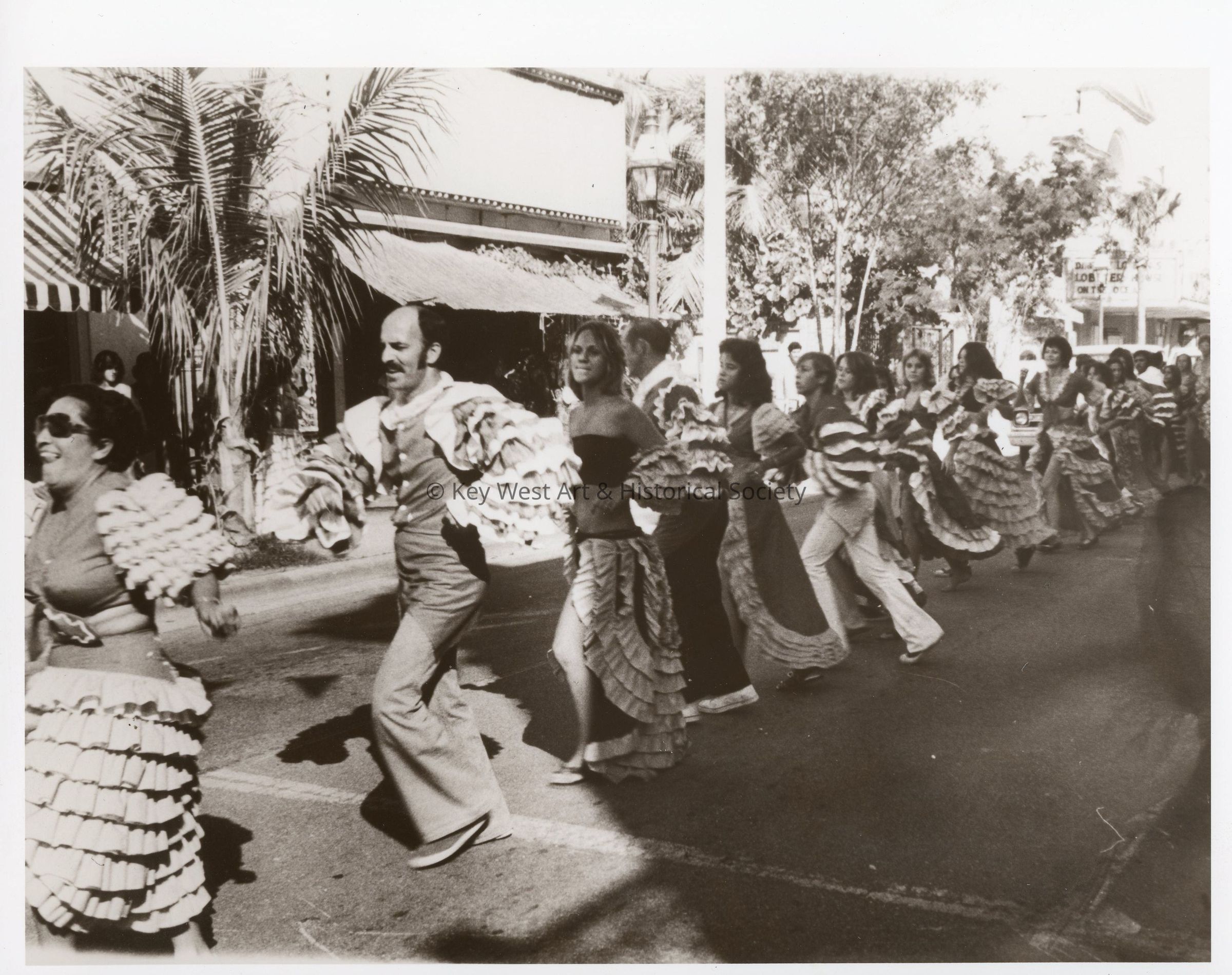 Black and white photograph of a parade along Duval Street in front of the Strand Theater.