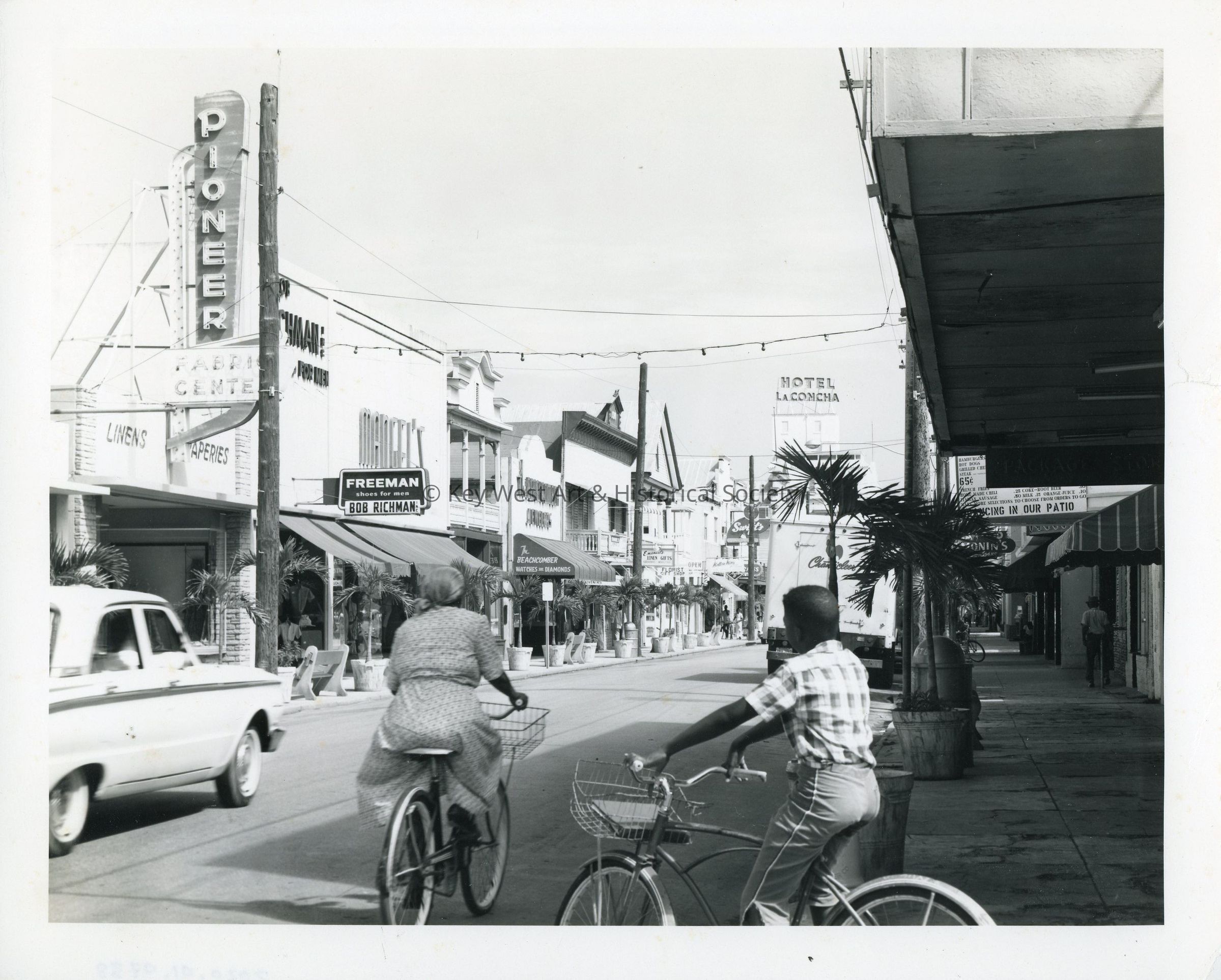 Black and white photograph of a Duval Street scene on the 600 hundred block looking north toward the Hotel LA Concha