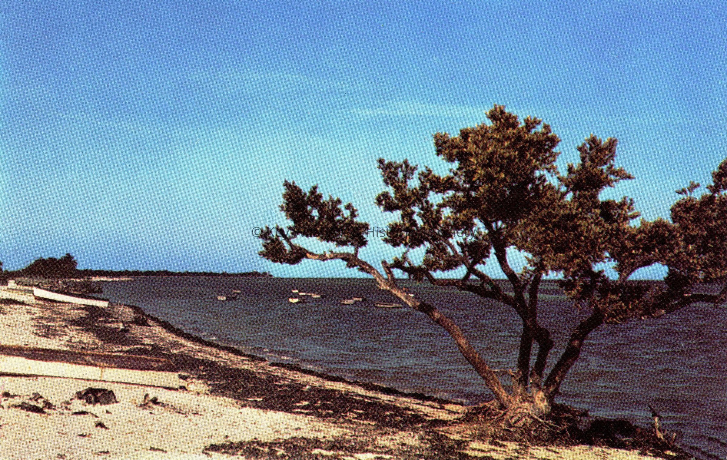 Postcard depicting a tree on the beach near boats moored offshore.  The description on the verso reads, 'Rest Beach, Key West, Florida.'Subject Place