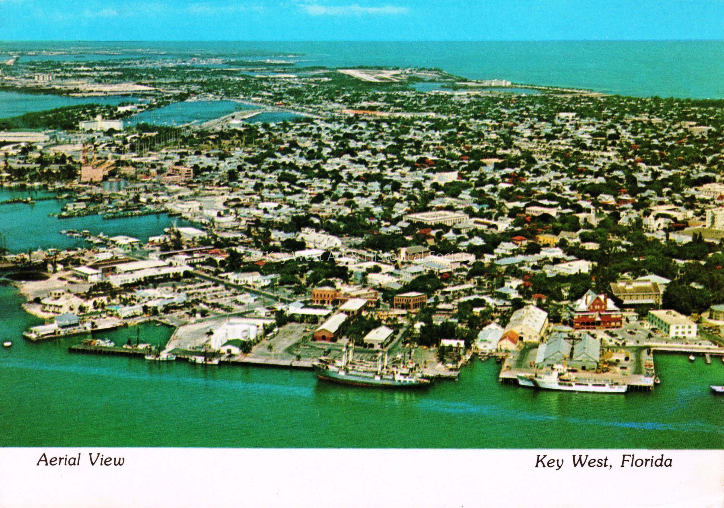 Postcard depicting aerial view of Key West, including the Custom House. The caption reads, ‘Aerial view, Key West, Florida’. The description on the verso reads, 'Aerial View, Key West, Florida. This is the two mile historic island of Key West, originally purchased by John Simonton of the United States from Don Pablo Salas of Havana, Cuba. Key West became a city in 1828. It was previously a haunt for wreckers, pirates and fishermen. The view from Old Mallory Square in the foreground from the Gulf of Mexico in the north to the Atlantic Ocean in the south.' The message on the verso reads, 'Historic view of Key West in the 1950s?'Subject Place