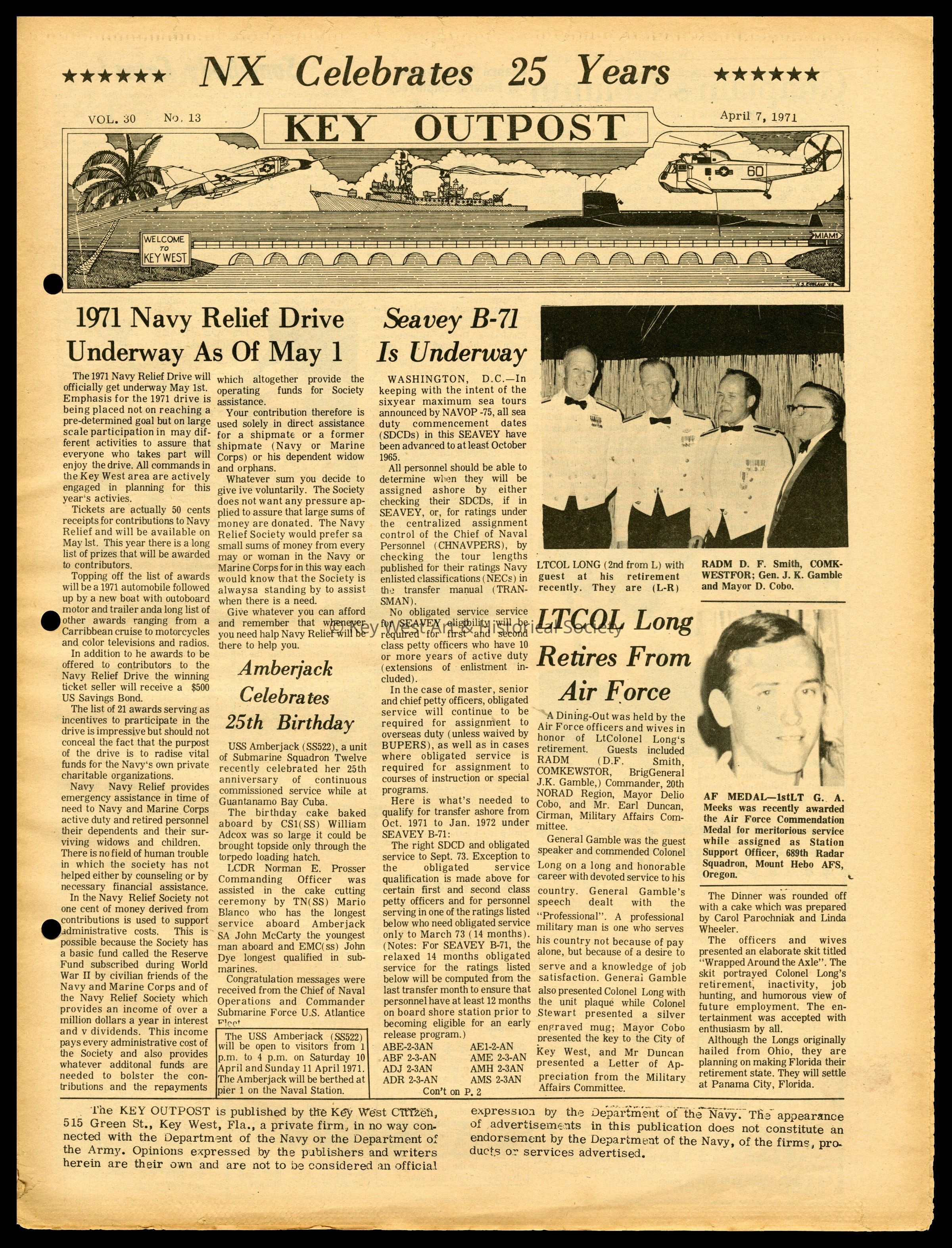 The April 7, 1971 edition of the 'Key Outpost' Newspaper printed by Naval Station Key West as an internal newsletter for military and civilians on base.  Volume 30, Number 13.  Eight pages.Collection