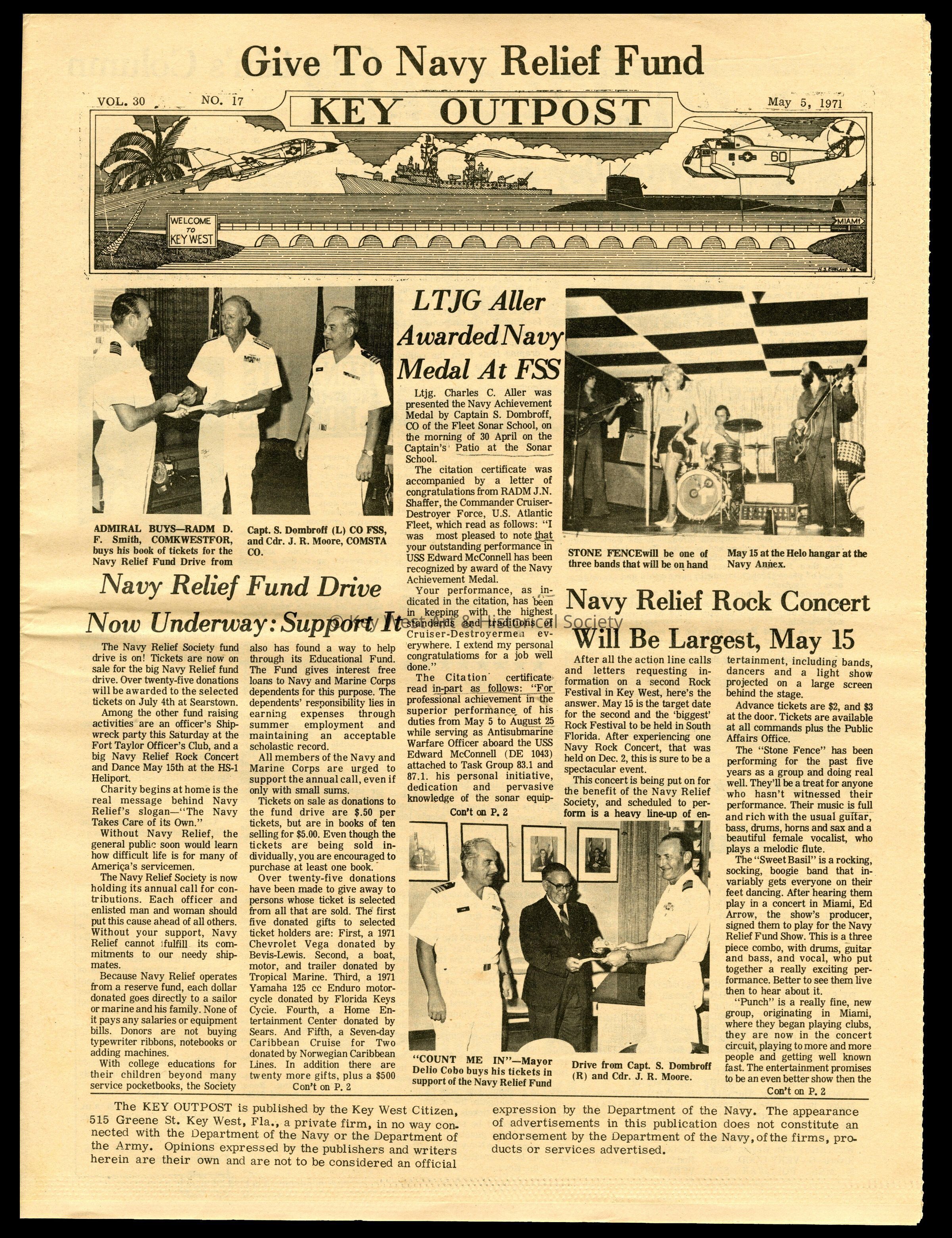 The May 5, 1971 edition of the 'Key Outpost' Newspaper printed by Naval Station Key West as an internal newsletter for military and civilians on base.  Volume 30, Number 17.  Twelve pages.Collection