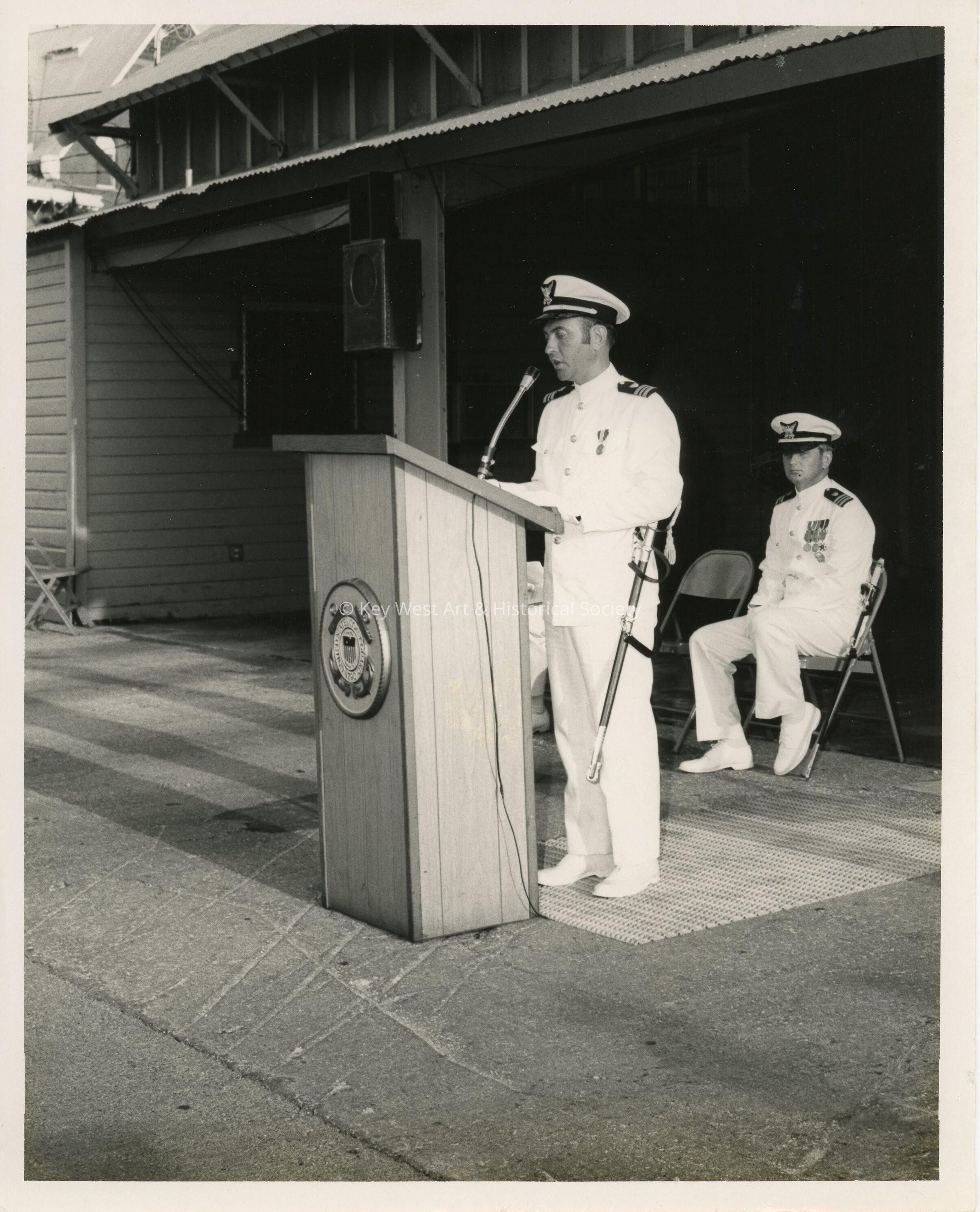 Black and white photograph of a U.S. Coast Guard Change of Command Ceremony.