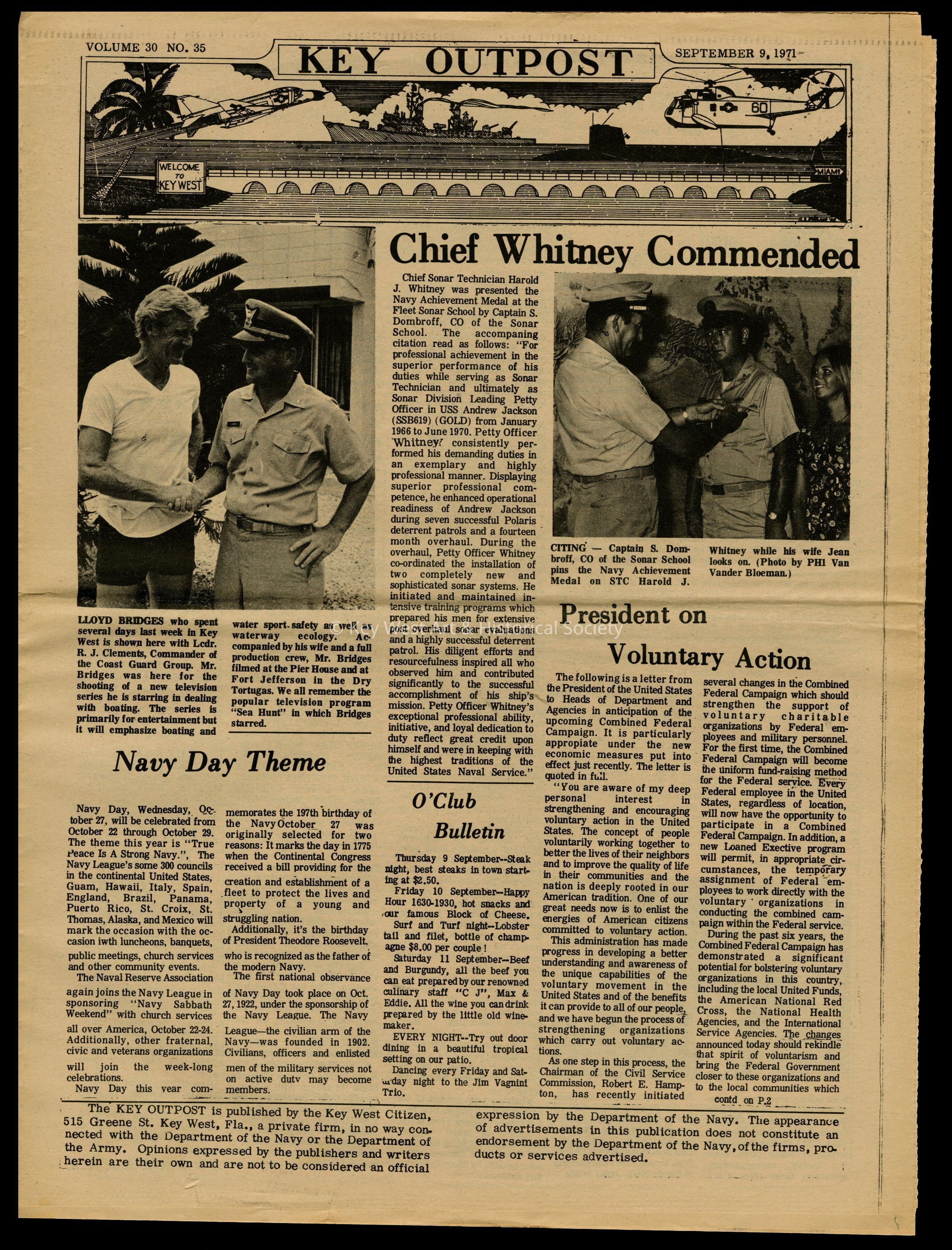 The September 9, 1971 edition of the 'Key Outpost' Newspaper printed by Naval Station Key West as an internal newsletter for military and civilians on base.  Volume 30, Number 35.  Eight pages.Collection