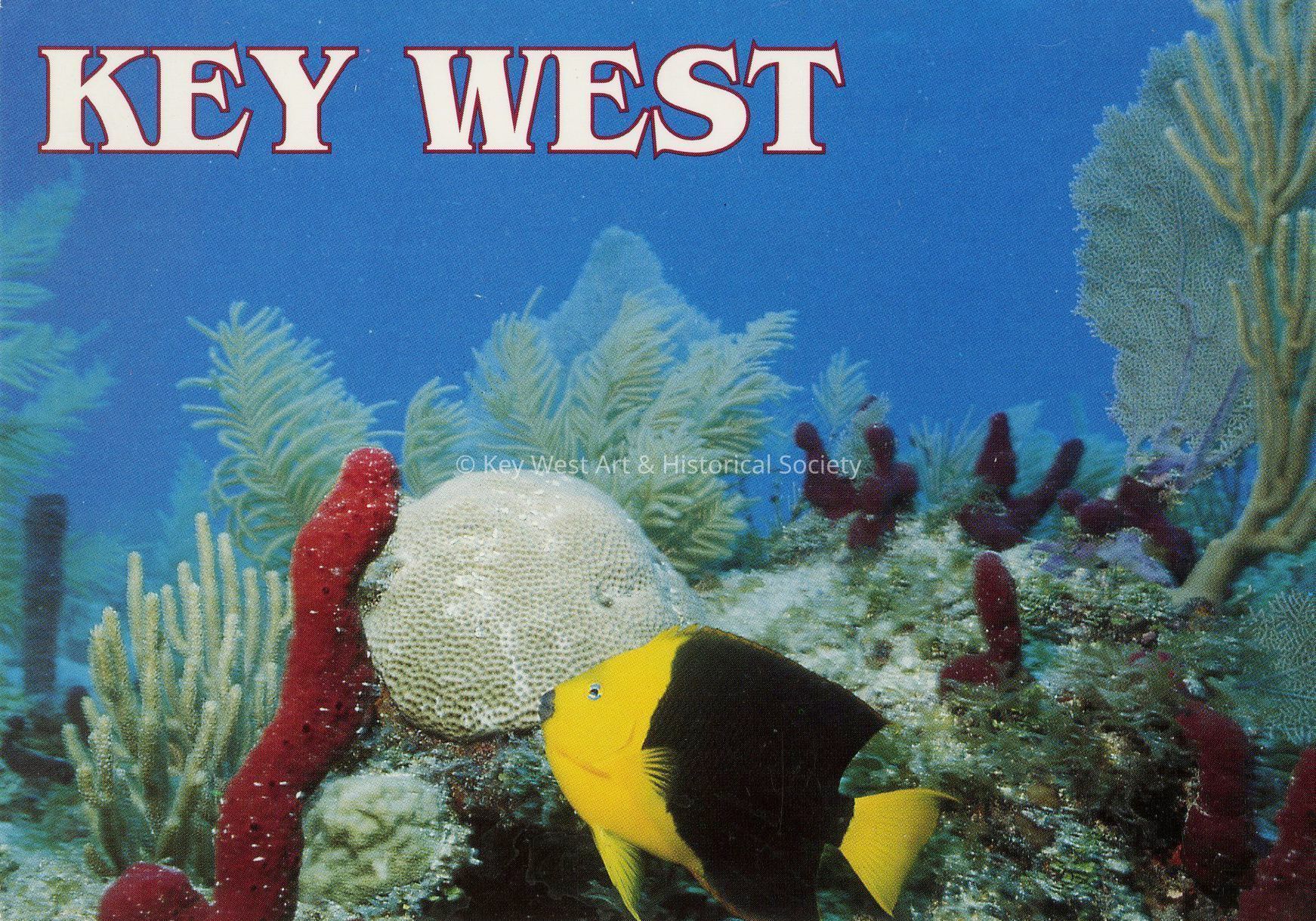Color postcard depicting tropical fish and the coral reef. Notation on verso, 'A Rock Beauty swimming on the colorful reef off the Florida Keys.'