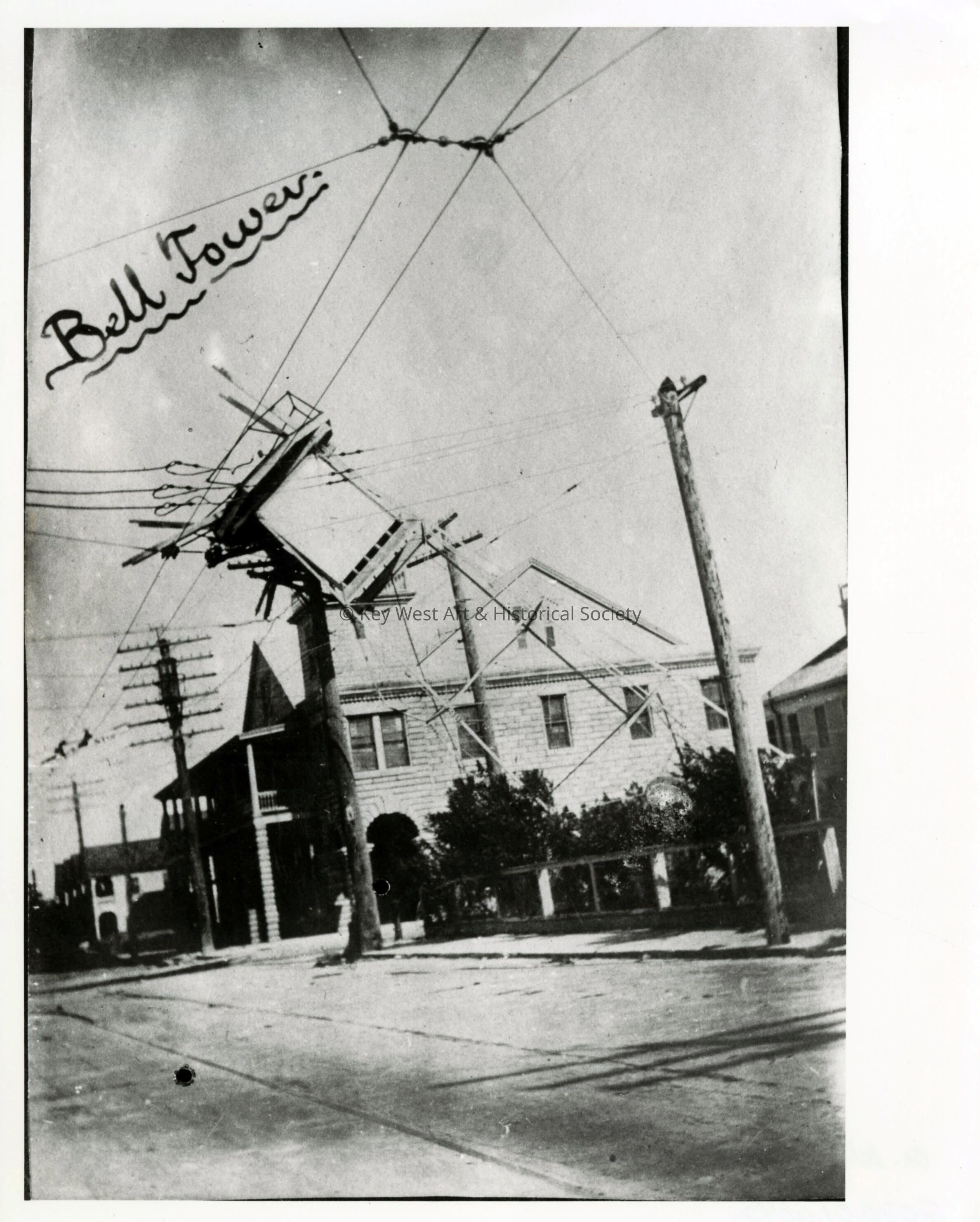 Black and white photograph showing hurricane damage at the corner of White Street and Division Street (now Truman Avenue) following the hurricane of 1909.