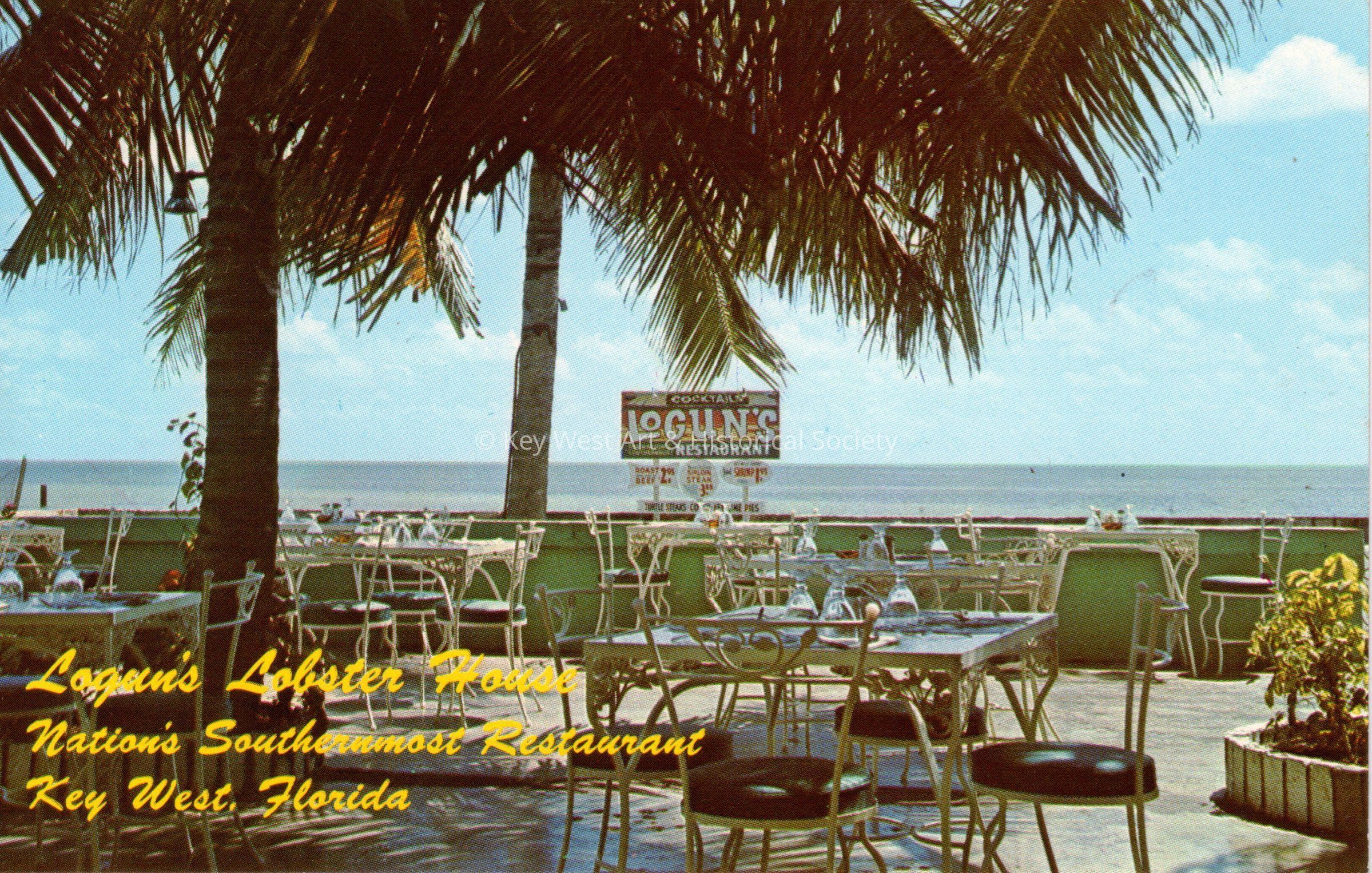 Postcard depicting restaurant tables near the water.  The caption reads, ‘Logun’s Lobster House, Nation’s southernmost restaurant, Key West, Florida’.  The description on the verso reads, 'The Diner's Club, Logun's Lobster House, the Nation's Southernmost Restaurant, Cocktail Lounge.  Steaks - Native Seafood - Entertainment overlooking the Atlantic Ocean, Key West, Florida.'Subject Place