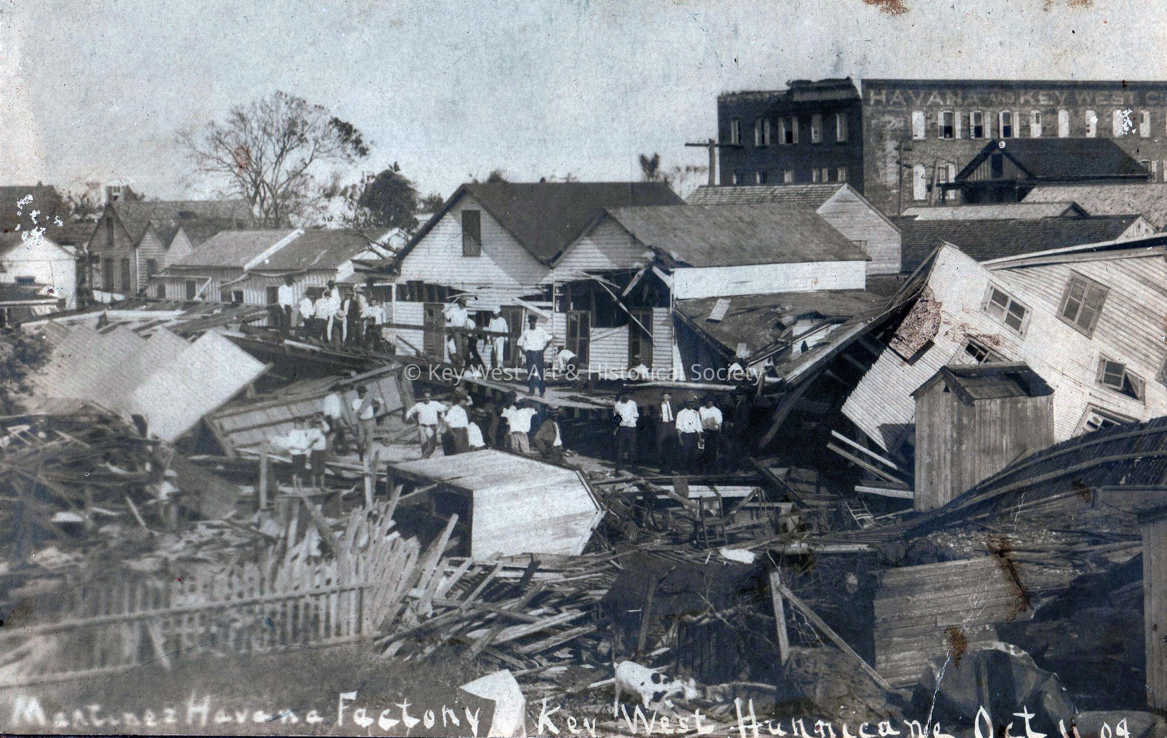 Black and white photograph of the Martinez Havana Cigar Factory after sustaining damage by the hurricane of October 11, 1909. Workers and bystanders stand amidst the debris of collapsed structures and scattered materials, conveying a scene of destruction and recovery efforts.Photograph Details