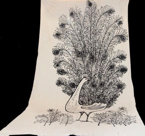 Screen printed peacock on cotton created by Suzie dePoo at Key West Hand Print Fabrics.