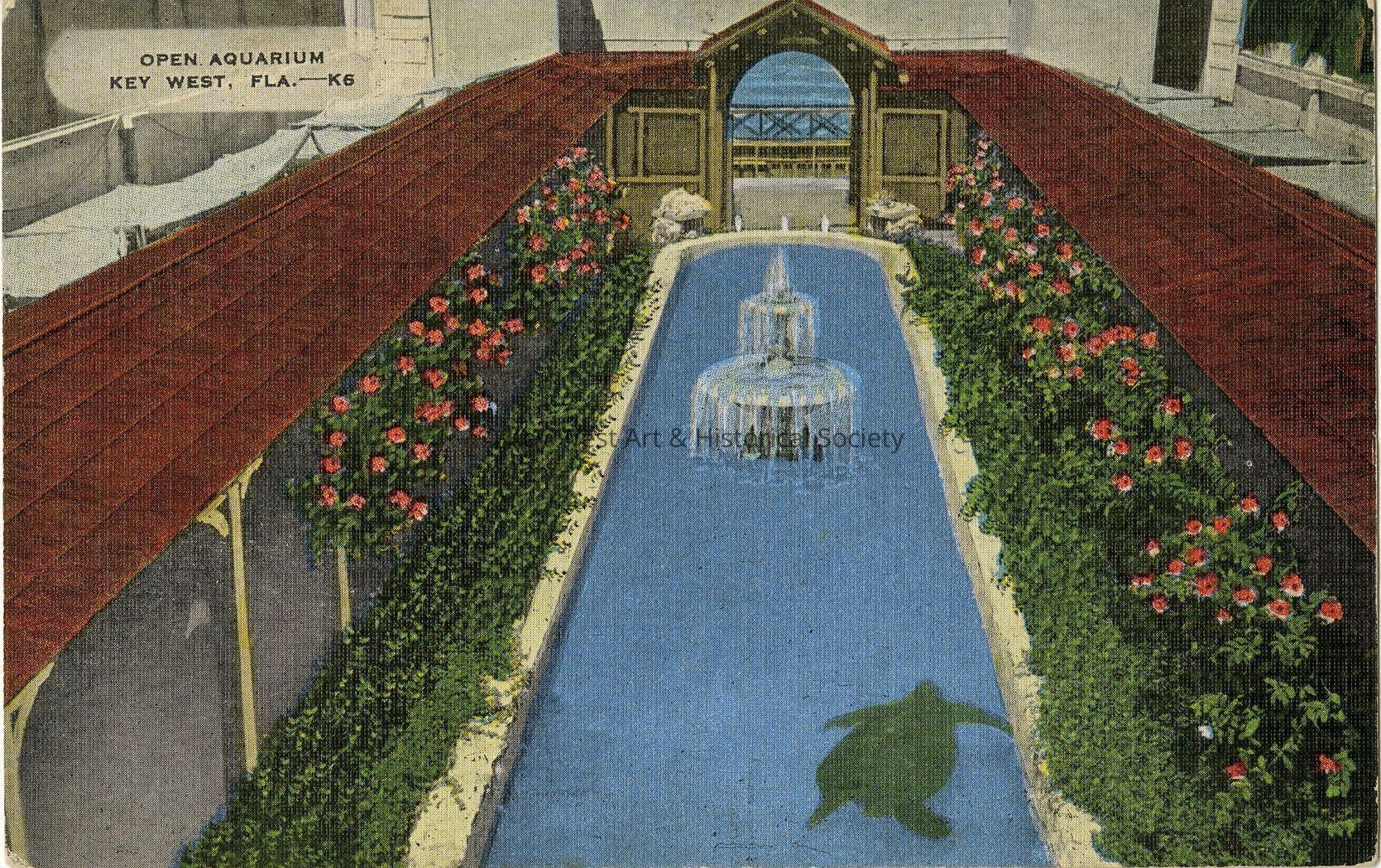Postcard depicting the open aquarium in Key West, Florida. "The aquarium is one of the most interesting small displays of sea life to be found anywhere. The project was built with CWA and FERA federal funds. Unique tropical fish, some of brilliant color, are on display in tanks lighted and heated by the sun and through which salt water is pumped."Collection