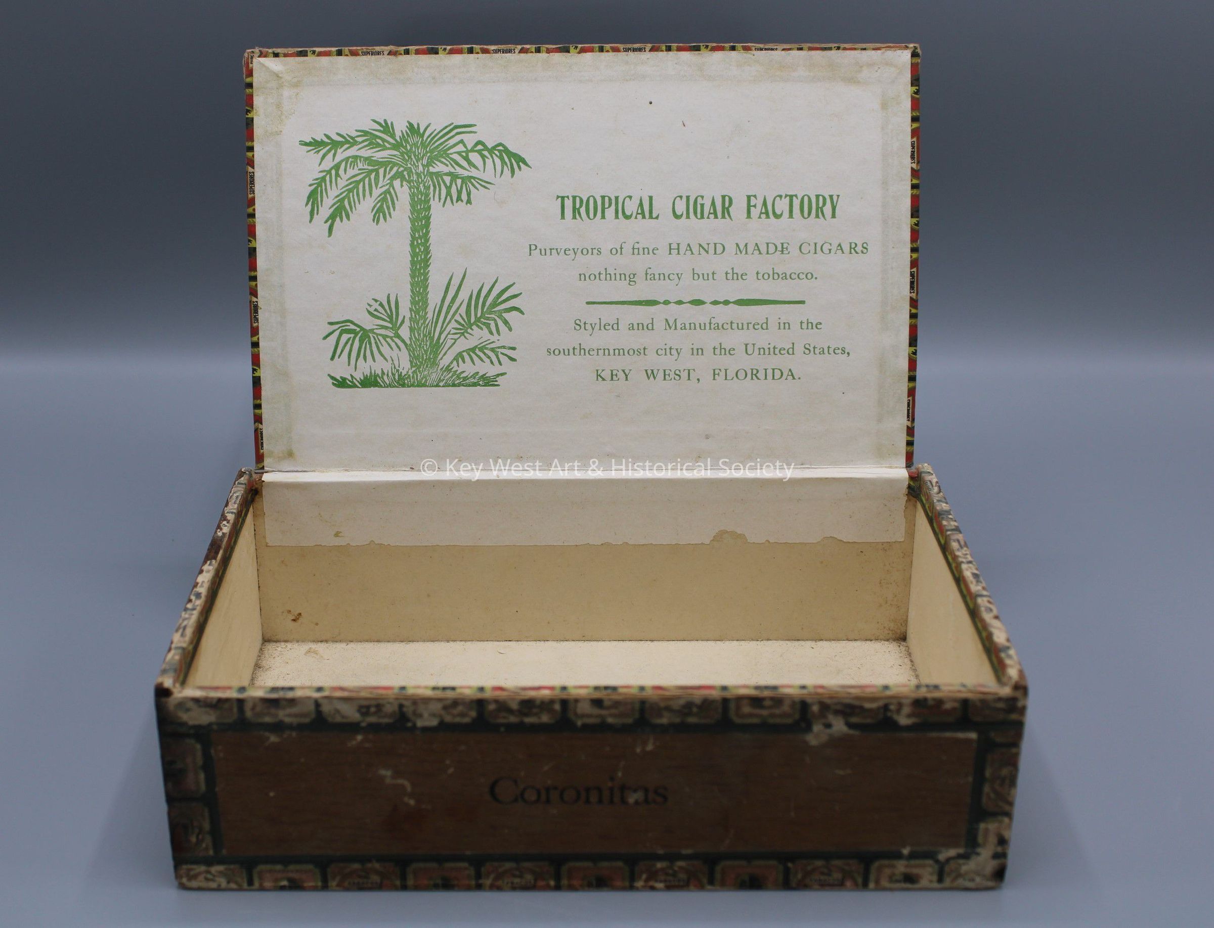 A wooden cigar box with a logo for the Tropical Cigar Factory of Key West on the lid. The box was meant to hold hand rolled Coronitas cigars. The edges of the box are lined with paper featuring illustrations of miniature crests. The interior of the lid has a label for the Tropical Cigar Factory with a palm tree and green text. The Factory was originally located at 918 Duval Street.