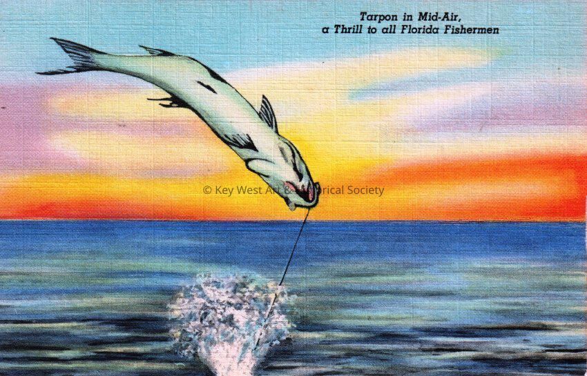 Postcard depicting a large fish on a line, leaping from the water. The caption reads, ‘Tarpon in mid-air, a thrill to all Florida fishermen’.Subject Place