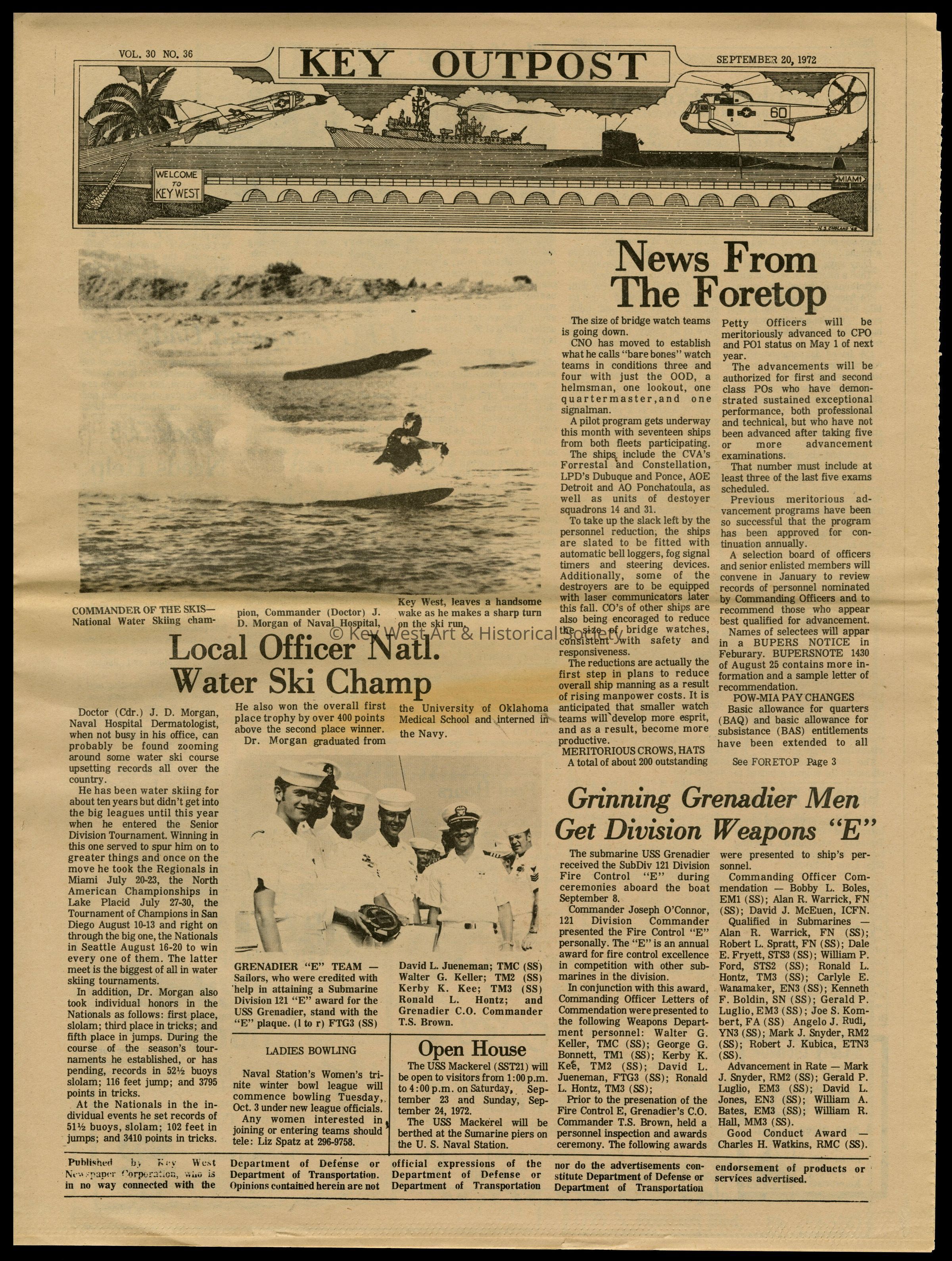 The September 20, 1972 edition of the 'Key Outpost' Newspaper printed by Naval Station Key West as an internal newsletter for military and civilians on base. Volume 31, Number 36. Eight pages.Collection