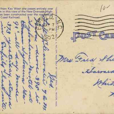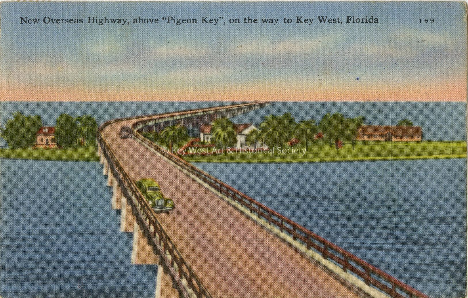 Postcard depicting the new Overseas Highway over Pigeon Key, on the way to Key West, Florida. Motoring to and from Key West one passes entirely over Pigeon Key as shown in this view of the New Overseas Highway. This marvel has been constructed over the roadbed of the old Florida East Coast Railroad.Collection