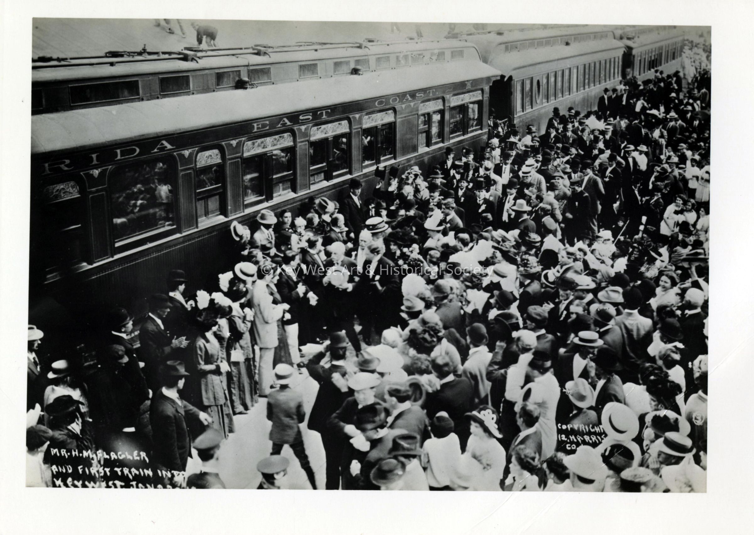 Black and white photograph of Henry Morrison Flagler, Mary Lily Kenan Flagler, and dignitaries taken when the Flaglers arrived on the first Florida East Coast Railway train in Key West.Photograph Details