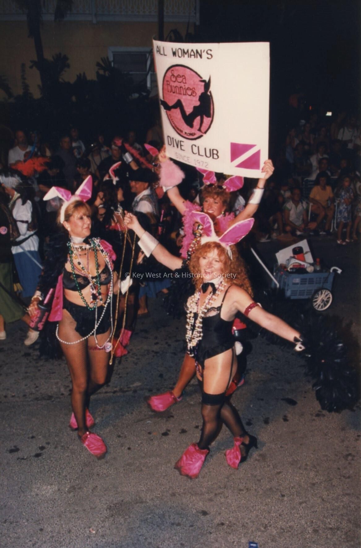 Unknown woman dressed up and holding a sign that says All Woman's dive club.Collection