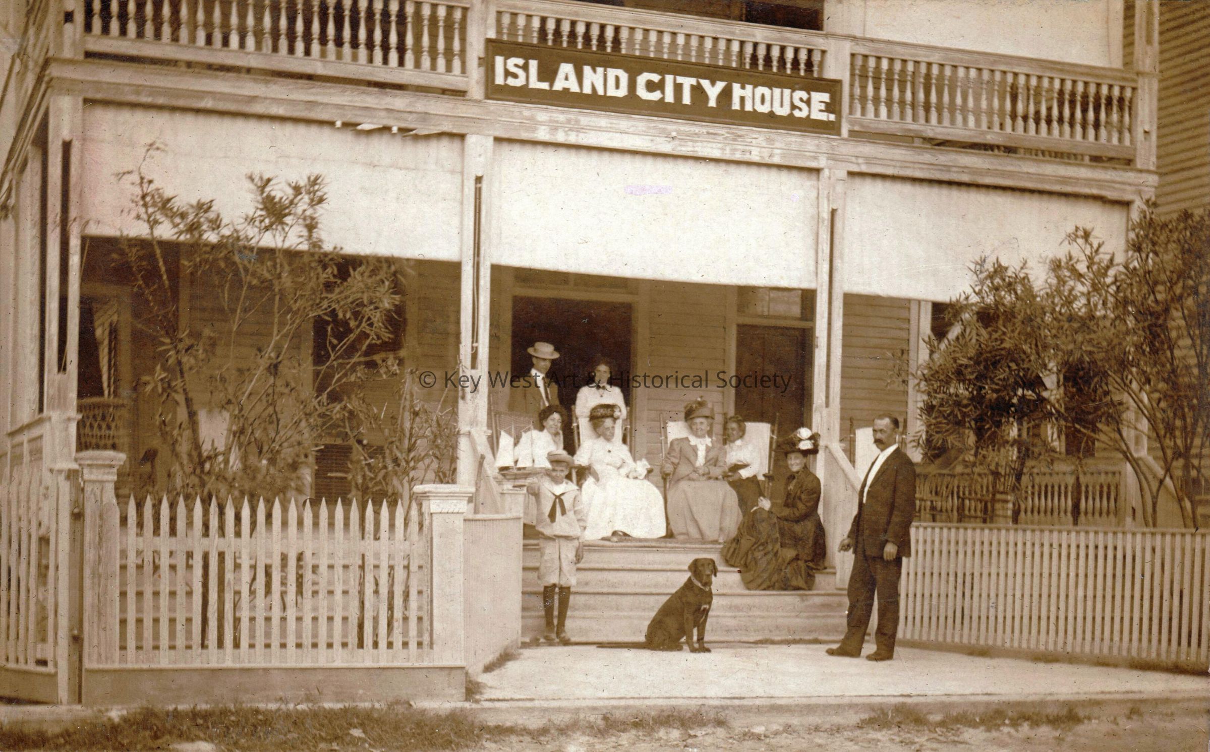 Postcard depicting people and a dog in front of the Island City House at 411 William Street. This was one of Key West's earliest accommodations that opened after the arrive of the Florida East Coast Railway.Subject Place