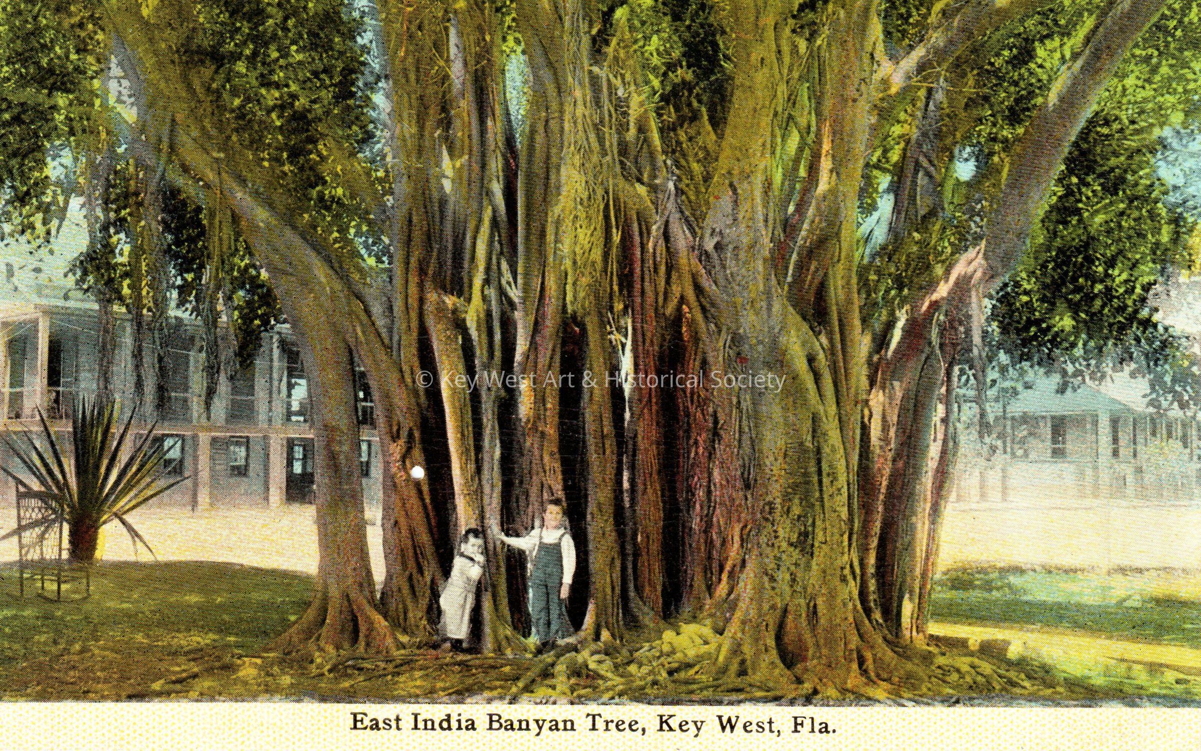 Postcard depicting two young boys standing alongside a banyan tree near the Army Barracks. The caption reads, ‘East India Banyan Tree, Key West, Florida’.Subject Person/Organization
