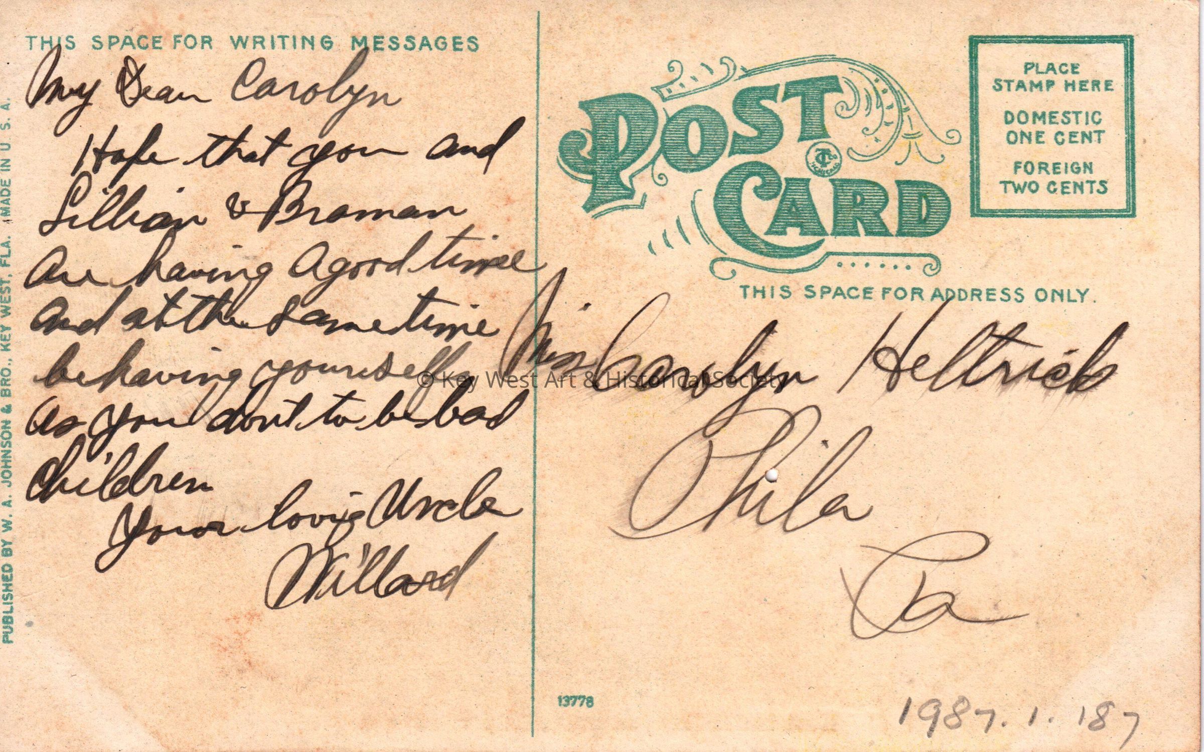 My Dear Carolyn, Hope that you and Lillian, and Braman are having a good time and at the same time behaving yourself as you don’t want to be bad children. Your loving Uncle Willard.Language