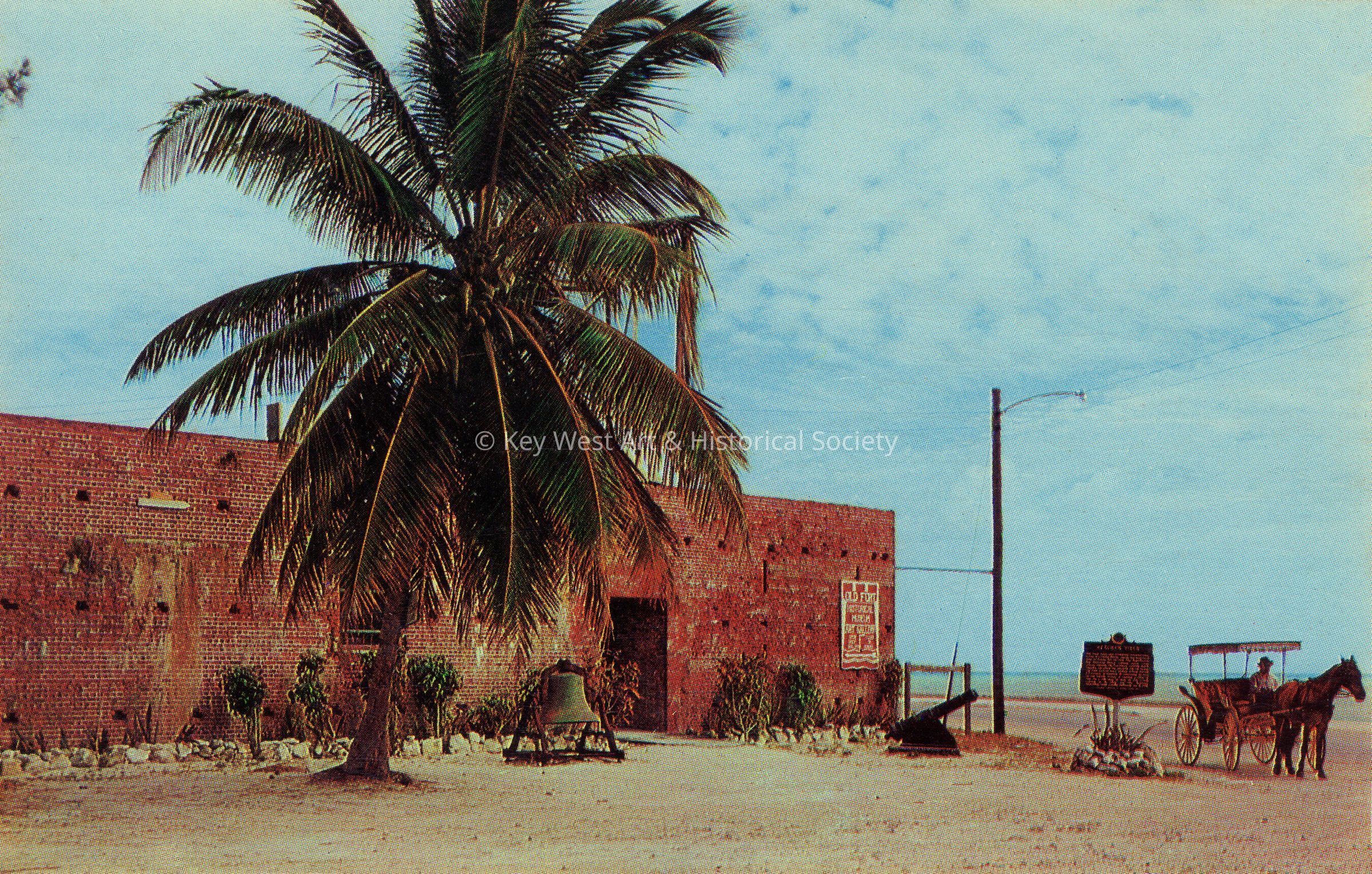 Postcard depicting a horse-drawn carriage near East Martello, Key West, Florida. The description on the verso reads, 'East entrance to The Martello Towers and Old Civil War Fort. The Navy has now given the Key West Art and Historical Society a revocable permit to use the structure for art galleries and historical museum.'Collection