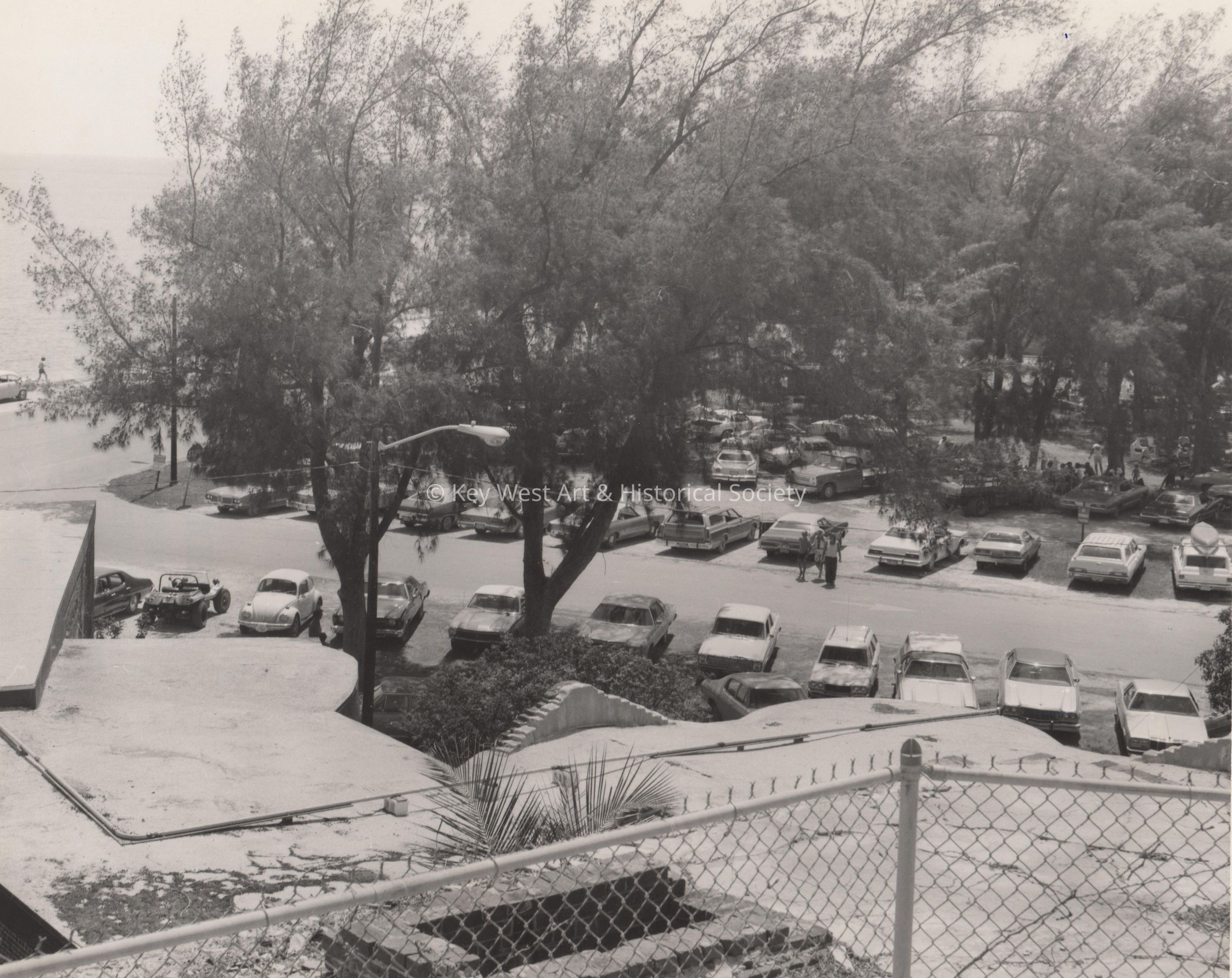 view of parking lot and beach from fort