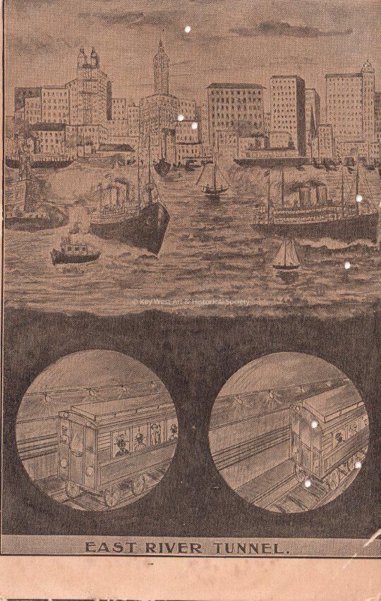 Postcard depicting a subway passing under a river near a large city. The caption reads, ‘East River Tunnel.’Collection
